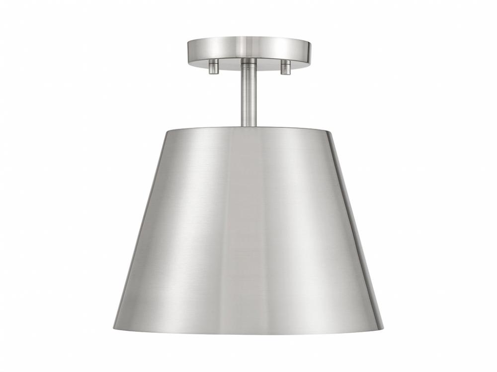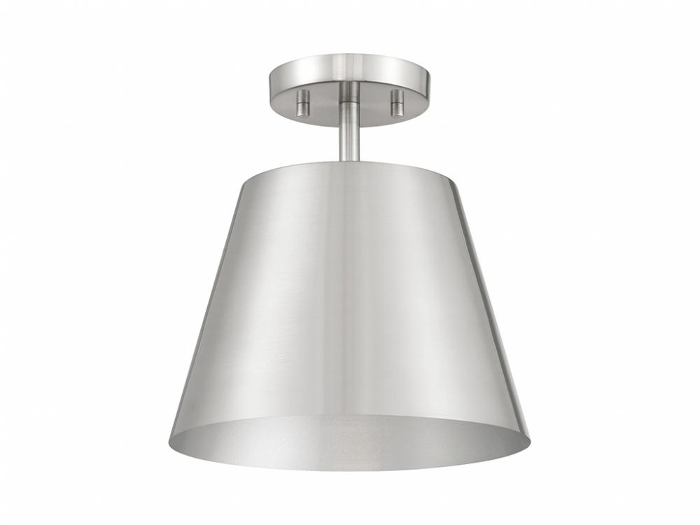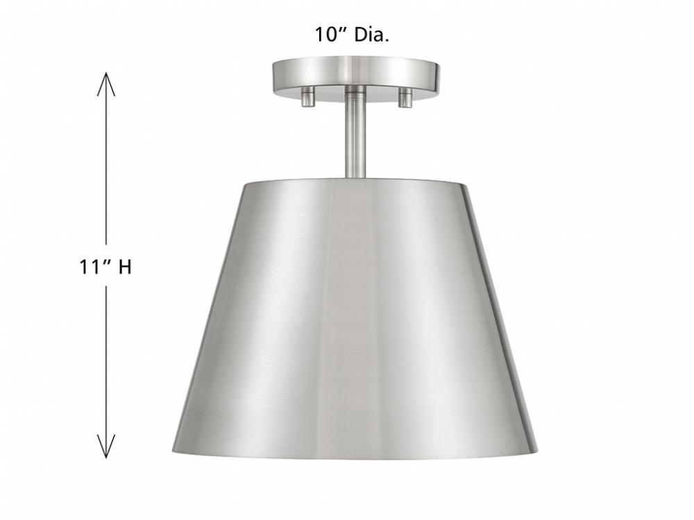 This sleek, chic 1-light ceiling semi-flush mount has a bold solid metal shade to concentrate and direct the light for a bright and dramatic glow. Its Brushed Nickel finish heightens the appeal. 11" height, 10" width, uses 1 standard size bulb of up to 60 watts. Bulb not included.