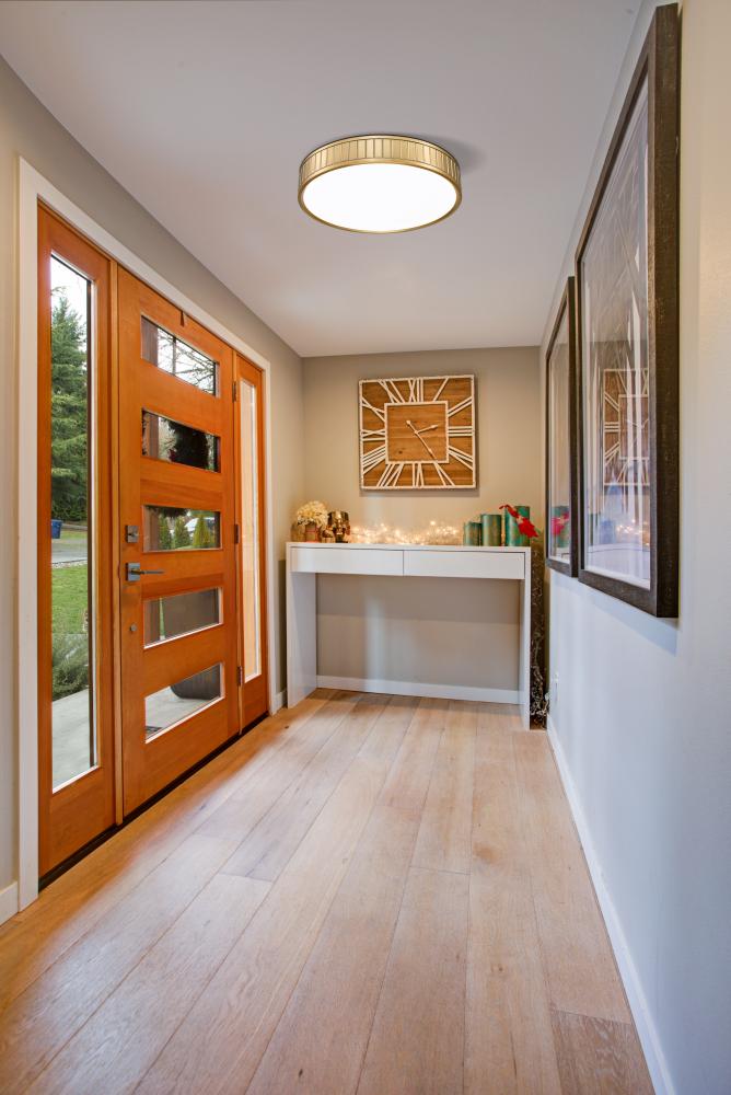 A glam modern gold finish is warm and inviting as it complements updated living spaces with a low-key aesthetic. Steel construction forms a ring canopy with vertical slats nestling a frosted acrylic diffuser that sends optional and changeable white-color values to light up a modern kitchen, dining room, or foyer.