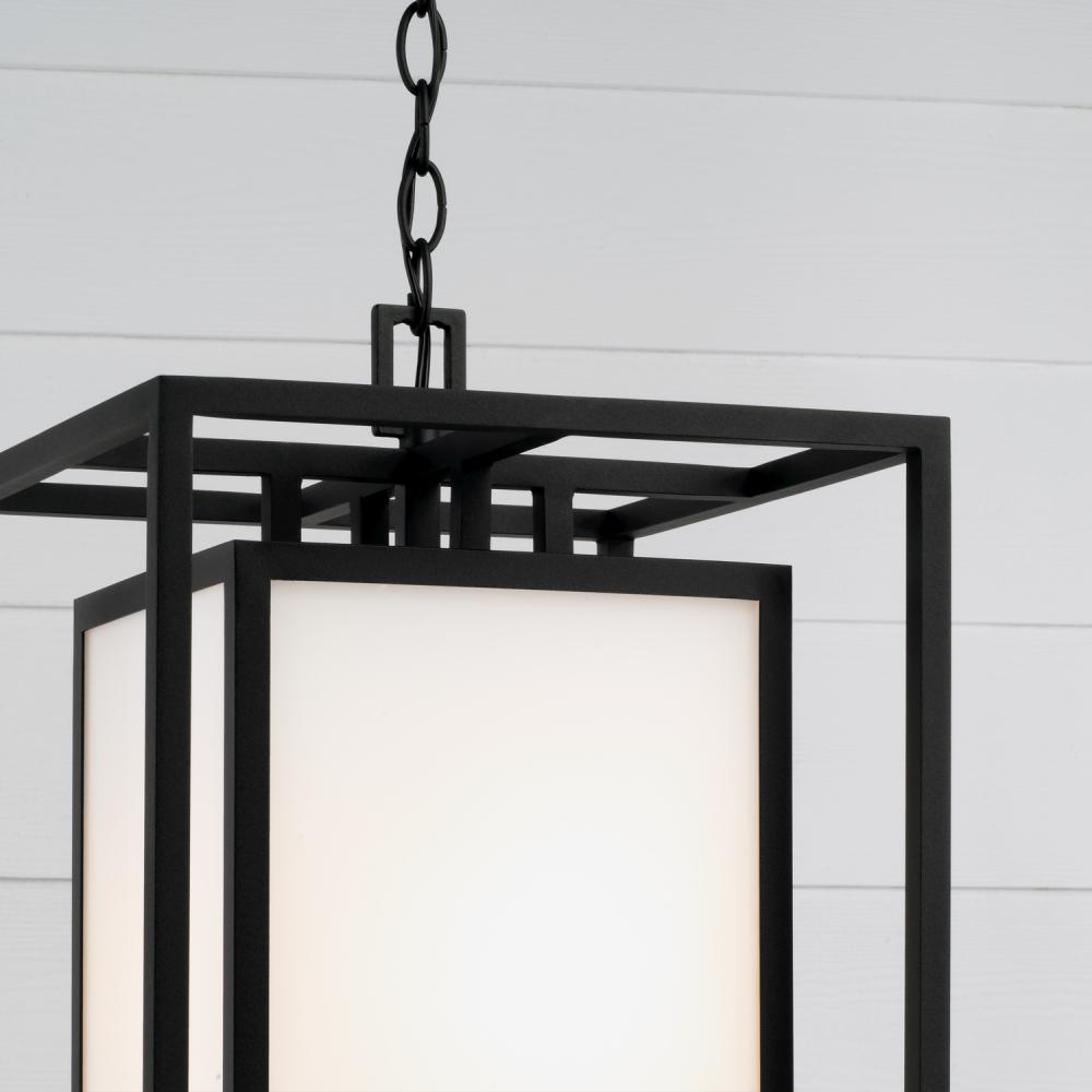 Neat and contemporary, the Aiden Outdoor Hanging Lantern creates the illusion of floating light with inner and outer rectangular forms. The Soft White glass panes cast a warm glow to perfectly complement the squared silhouette, while the Black finish delivers a distinct aesthetic. Part of our Rain or Shine Series and backed by our five-year warranty.