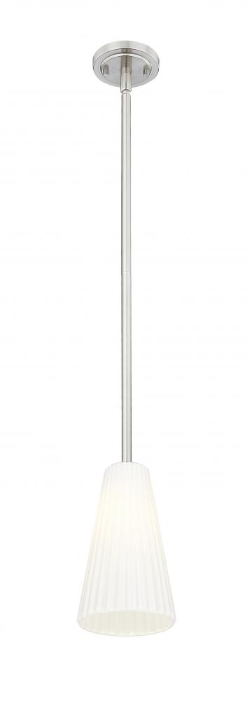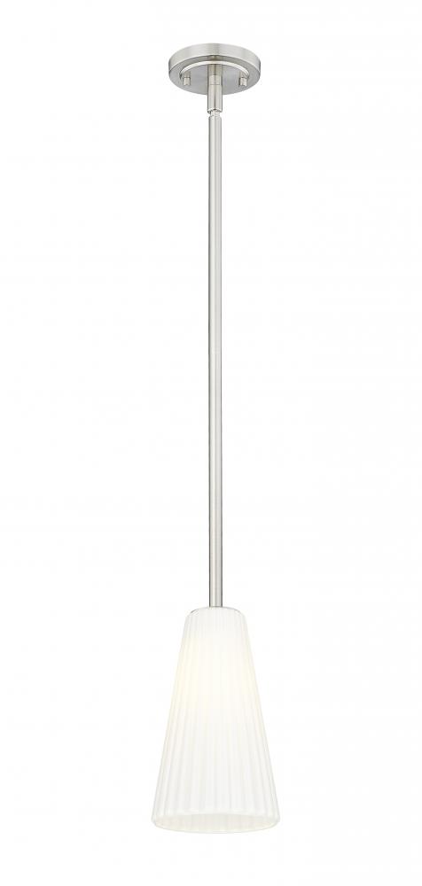 Radiant sophistication emanates from a modern one-light pendant. It pairs an elongated silhouette with a smooth, refined brushed nickel finish, capped with a delicately fluted white glass shade. Timeless and refined, this pendant delivers fresh style to your living space or bedroom, instantly elevating the surrounding decor.