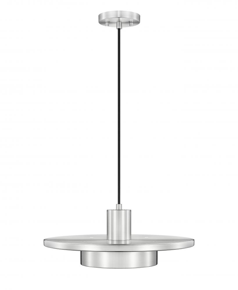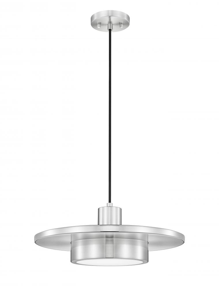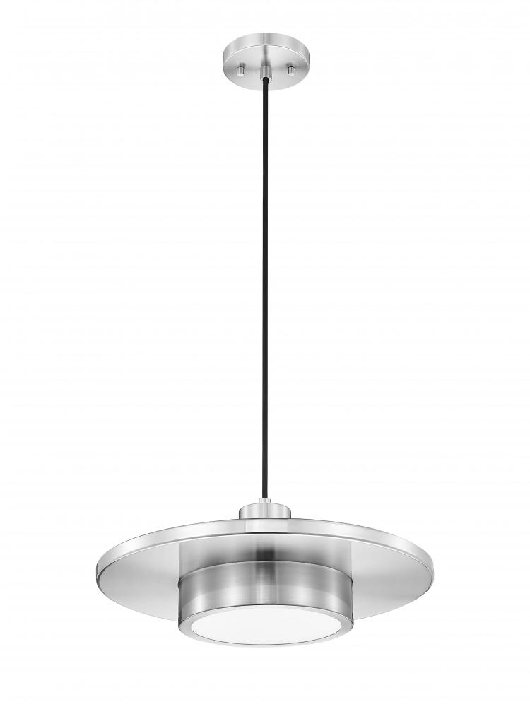 What started as minimalism turns into a fashionable tribute to art deco style as this single-light pendant light illuminates solo spaces. Stacked cylinder elements and a center disc reflect a cool brushed nickel finish over steel construction suspending from a black cord, with dimmable LED lighting flowing through a frosted acrylic shade, creating optional lighting levels.