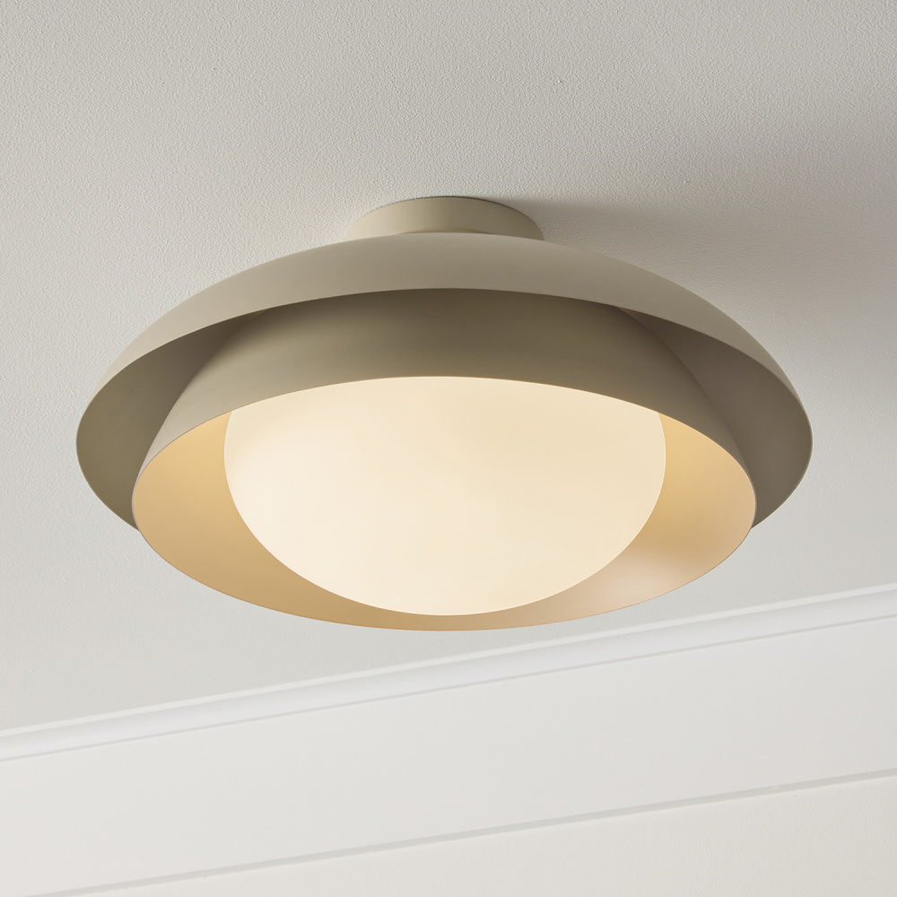 DETAILS: Finished in a serene matte Taupe hue, the nestled metal domes encompass a Soft White glass globe to create an all-around beautiful luminaire.