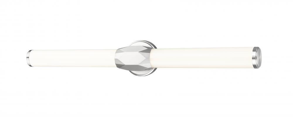 A cylindrical frosted plastic diffuser begins an Art Deco design that complements a host of bath space design schemes with this one-light vanity light. Aluminum framing with a cool brushed nickel finish includes end caps and a prism-inspired holder, furthering the rich geometric and complete package of a light fixture with optional color temperature values.