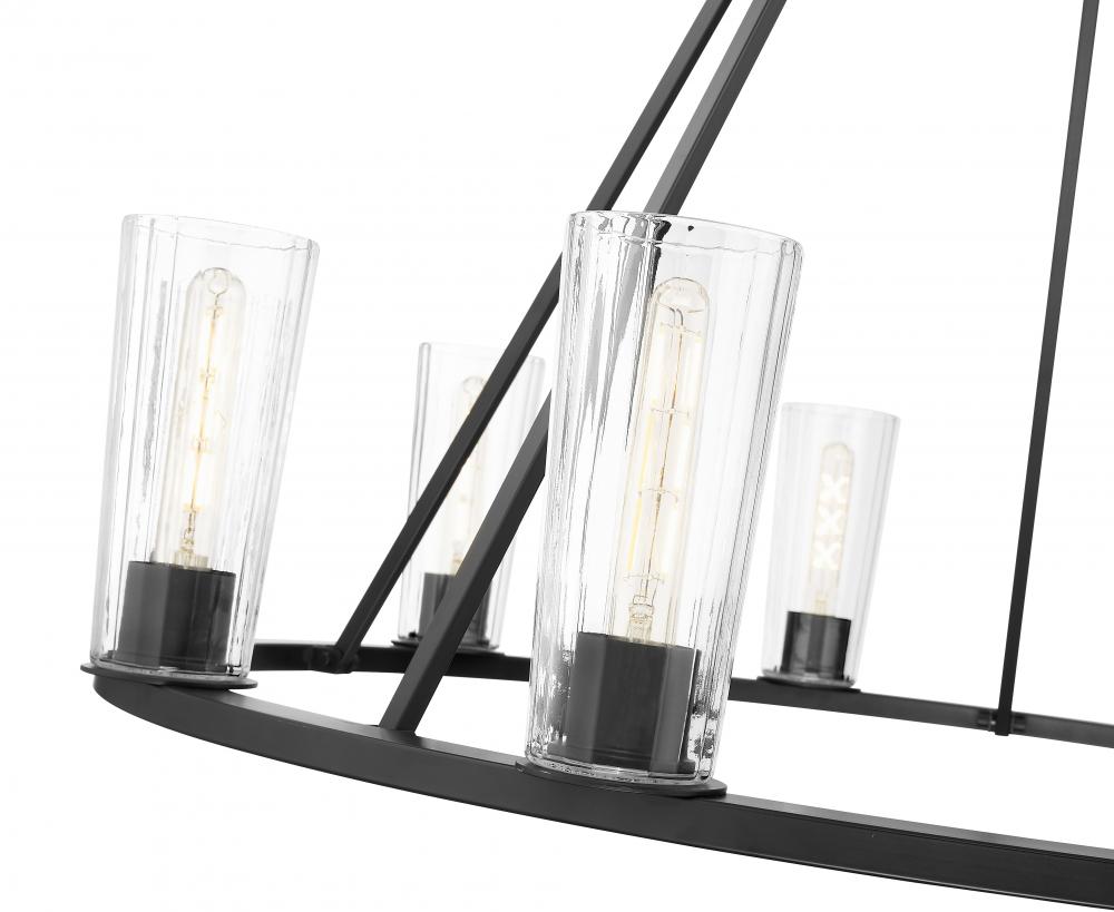 Gorgeous tubular bulbs pair with tapered glass shades to create exceptional illumination and style for a bold ten-light chandelier. A classic ring frame hosts its charming lights, with a conical silhouette created with down rods and chain link suspension. A matte black frame finish creates texture and depth for this superb fixture.