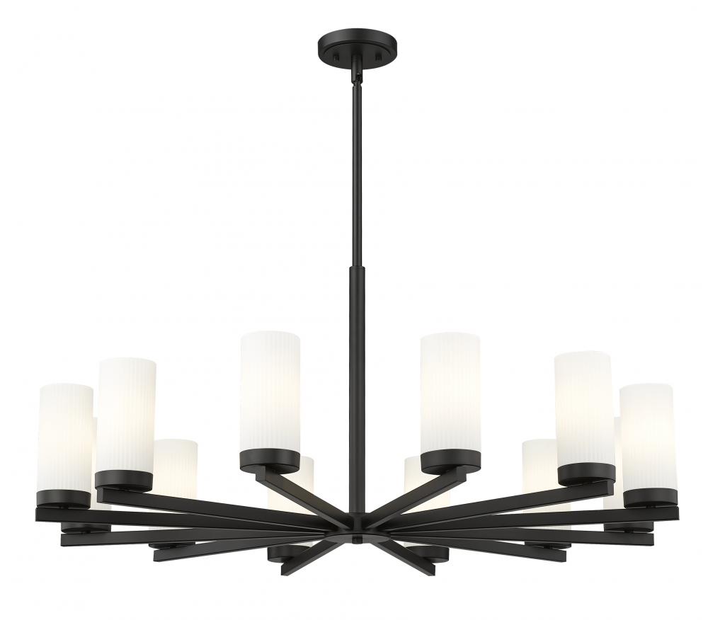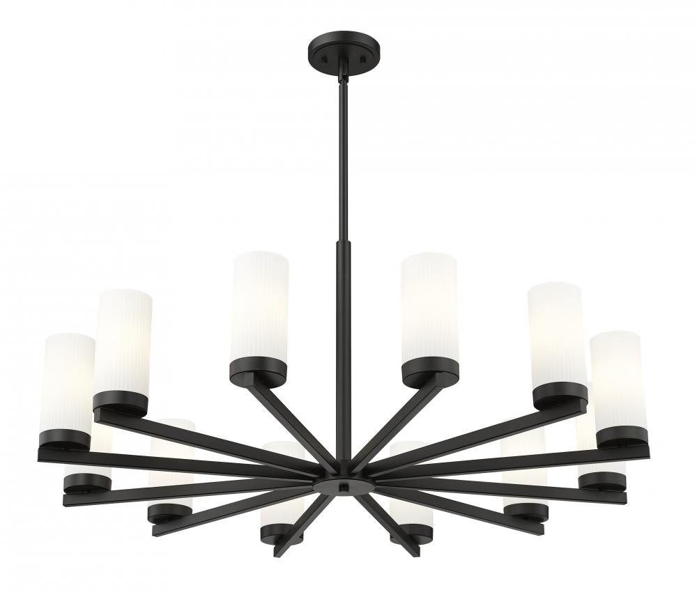 Fresh, clean style infuses a modern 12-light chandelier. Beautiful over a dining table, it shows off a crisp matte black finish paired with twelve white glass hurricane shades that create inviting luminosity. A radial profile and straight arms highlight its sleek allure, offering linear elegance in your kitchen, dining room or foyer.