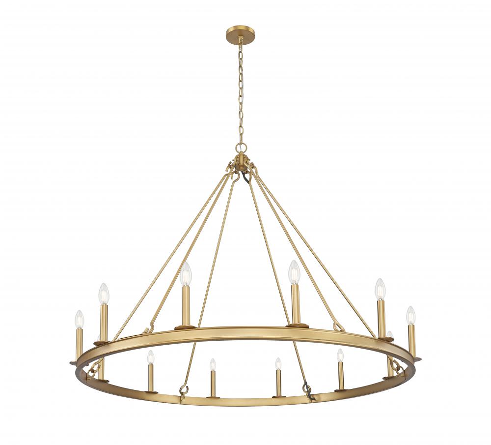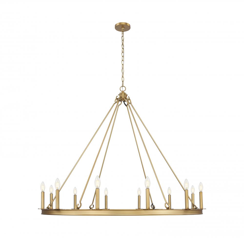 A classic ring frame lends drama of scale to this modern 12-light chandelier. Blending beautifully in coastal, contemporary, or restoration decor, it features a rubbed brass finish over steel construction, complete with candelabra light for soft, inviting illumination.