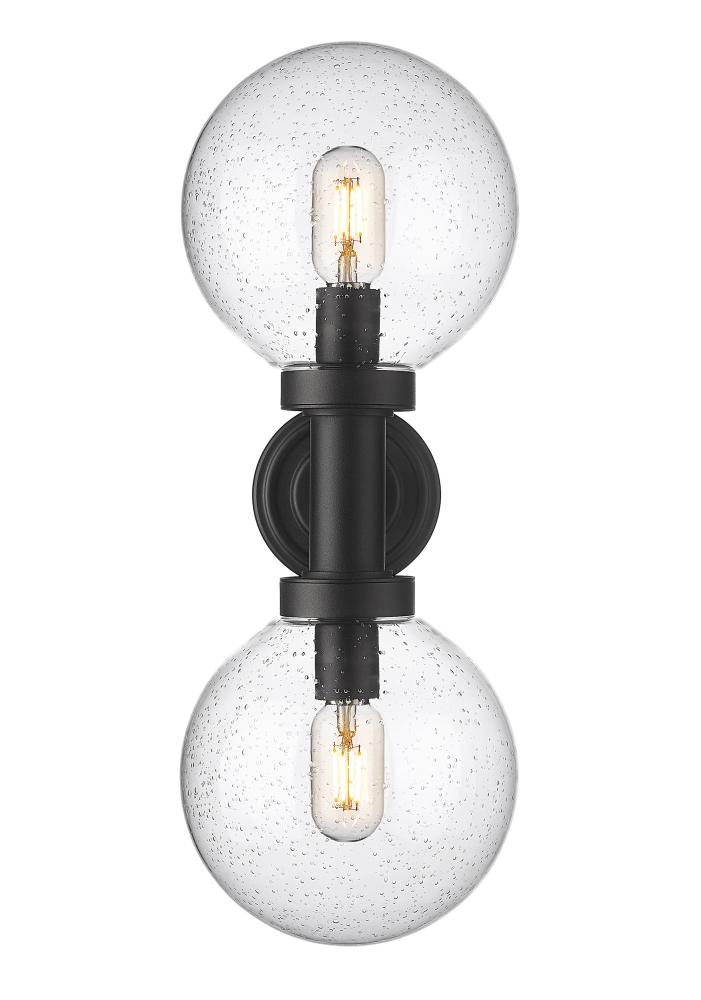 Lighting plays into a d?cor scheme focused on sheer style. From the Laurent collection comes a two-light outdoor wall sconce with a linear and circular blend of silhouetting. A simple yet tasteful black finish aluminum frame and wall plate hosts dual globe shades fashioned of delicate clear seedy glass.