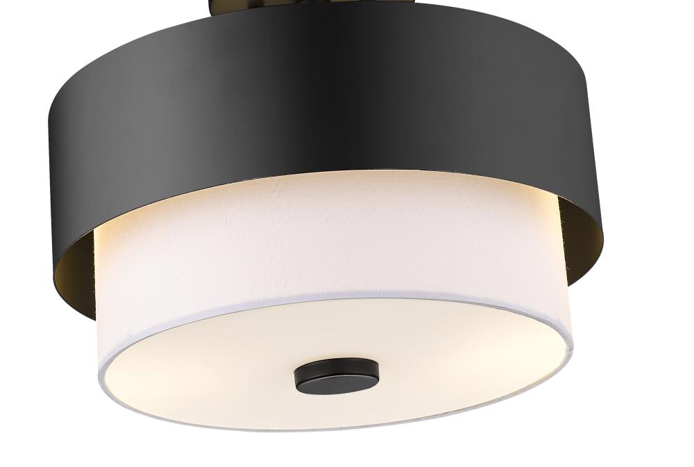 With a crisp contrasting finish palette that?s hard to miss, this Mid-Century Modern inspired semi-flush mount ceiling light draws focus upwards and delivers a sharp, clean look in a contemporary or transitional space. This two-light fixture from the Counterpoint collection reflects a cheerful round silhouette with a matte black metal frame and a soft white fabric shade. Call on a delightful and outspoken look to meet trending design aesthetics infusing ambient lighting in a kitchen, living area, or foyer.