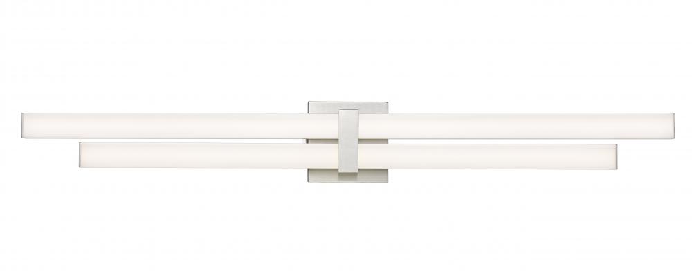 Light up a contemporary bath space with a dynamic structural vibe that makes a difference, choosing this two-light vanity light for function and aesthetics. Aluminum framing and accents offer a sleek brushed nickel finish, as graduated frosted bar diffusers align vertically to emit dimmable LED lighting with a customized option of white color values.