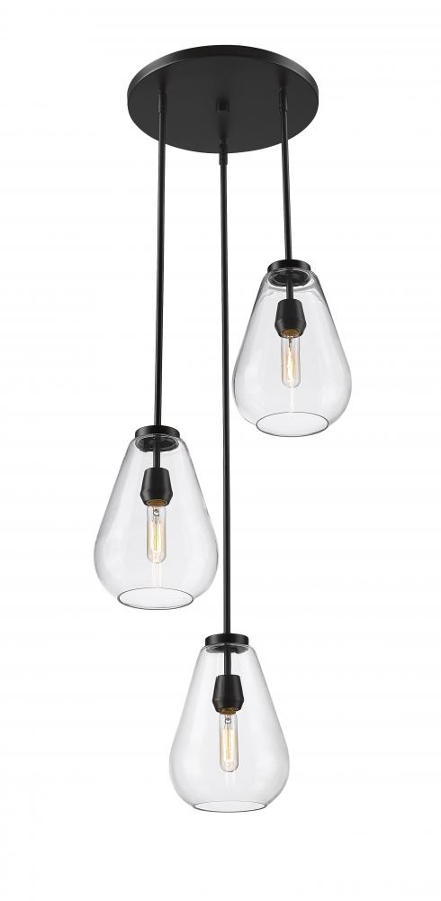 An eye-catching three-light chandelier perfectly encapsulates the modern aesthetic. Tapered bell-shaped shades are made from clear glass, suspended from a sleek steel frame with a matte black finish. The fixture brings a chic cutting edge to a contemporary kitchen or dining room.