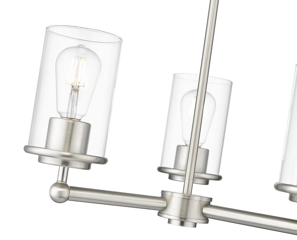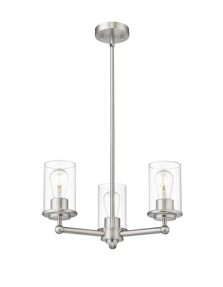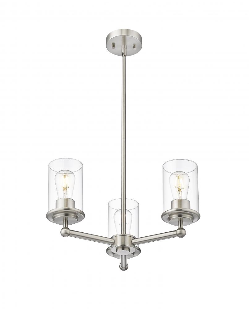 Timeless style elements infuse a sense of character in a modern three-light chandelier. Smooth, clear glass cylinders surround each light, nestled in a metal frame that adds a chic brushed nickel finish thats versatile and neutral in any setting. A gorgeous addition over a breakfast nook or even adding a glam touch in your dressing area.
