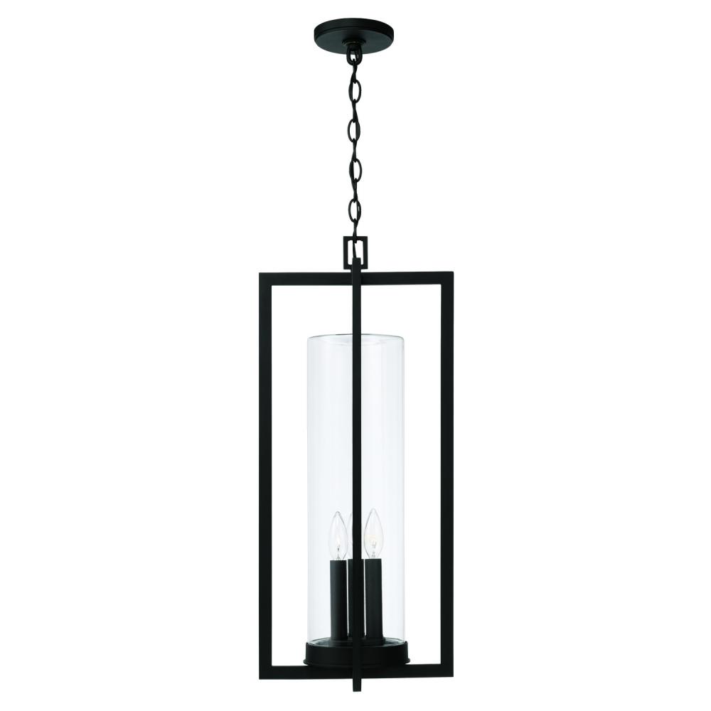 12"W x 27.25"H 3-Light Outdoor Hanging Lantern in Black with Clear Glass Cylinder