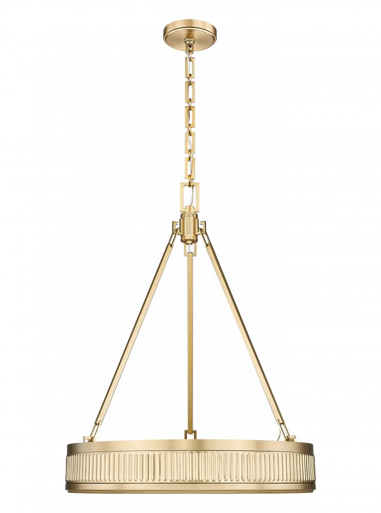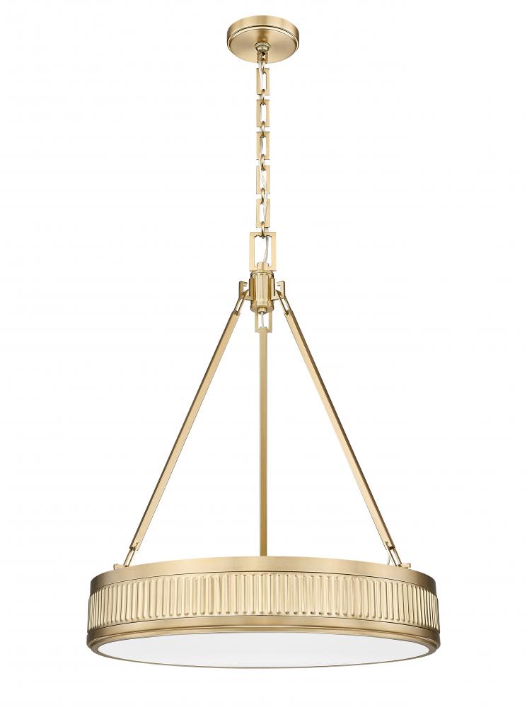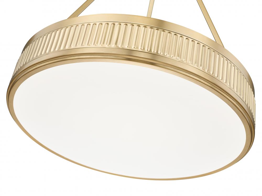 Fluted bands emphasize the sophistication that radiates from a modern three-light LED pendant. Its a shallow drum silhouette complete with an energy efficient Z-Lite EZ change LED module thats light color selectable and dimmable. The fixture is complete with a rich modern gold finish for pleasing elegance over a seating group or dining table.
