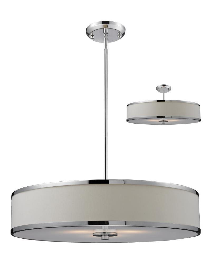 A white colored shade is paired with chrome bands and hardware to create a simple, contemporary look. This pendant includes an acrylic diffuser to soften the light. For a customized look, adjustable rods are included to ensure the perfect look. This pendant also comes able to be installed as a semi flush fixture.