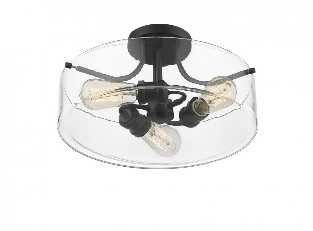 Play up an industrial motif with this charming three-light semi-flushmount ceiling light. Crafted in matte black with a clear glass shade, this stylish fixture is a wonderful update in a bedroom or home office.