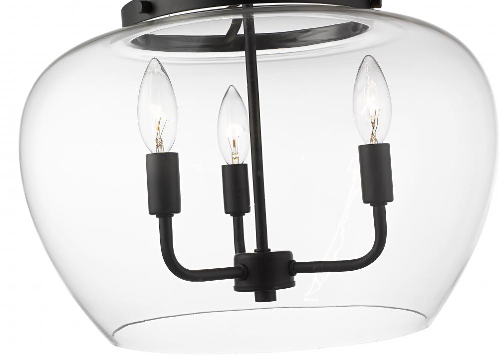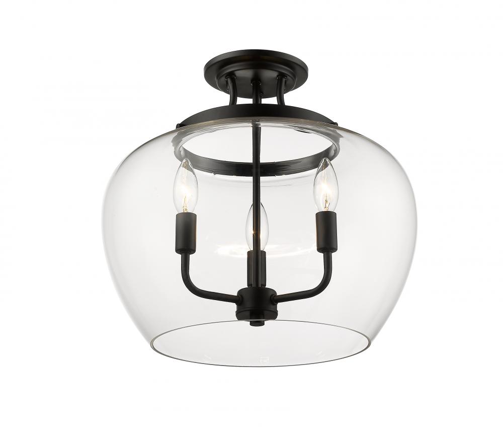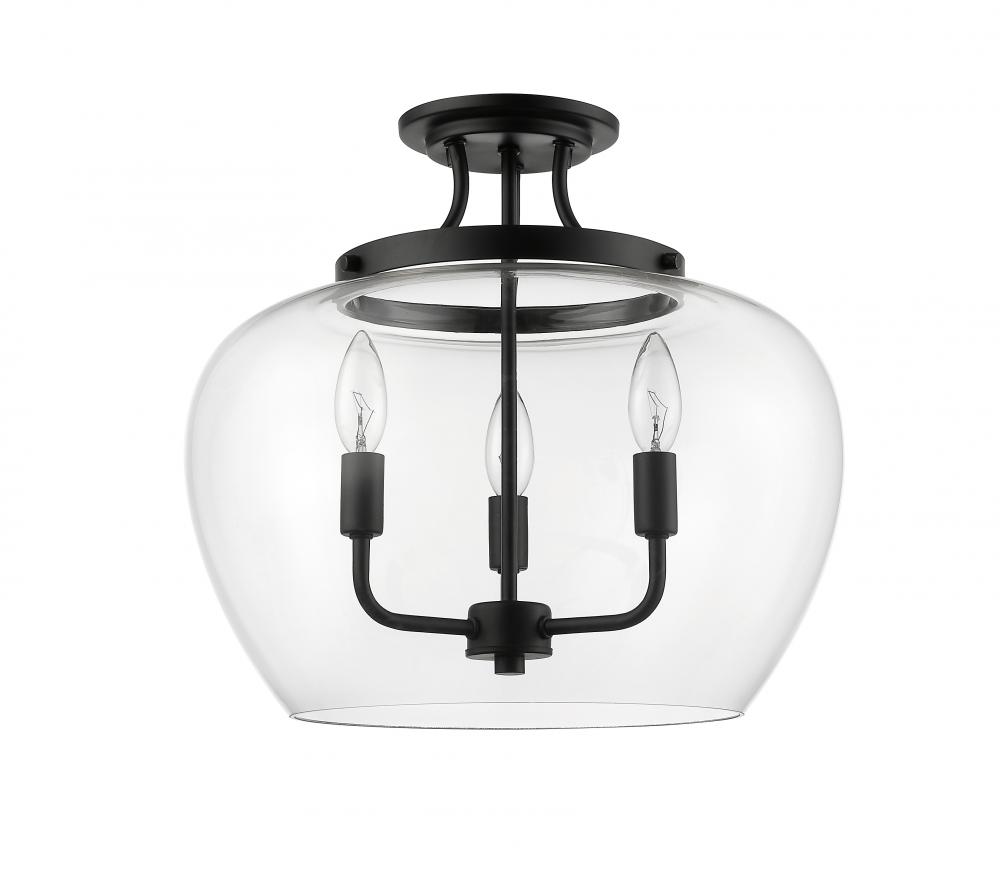 Designed with modern elegance in mind, this matte black semi-flush mount ceiling light is a stunning home decor upgrade. Three lights beneath a clear glass shade are suspended from a sleek metal frame to create a magnificent display of light.