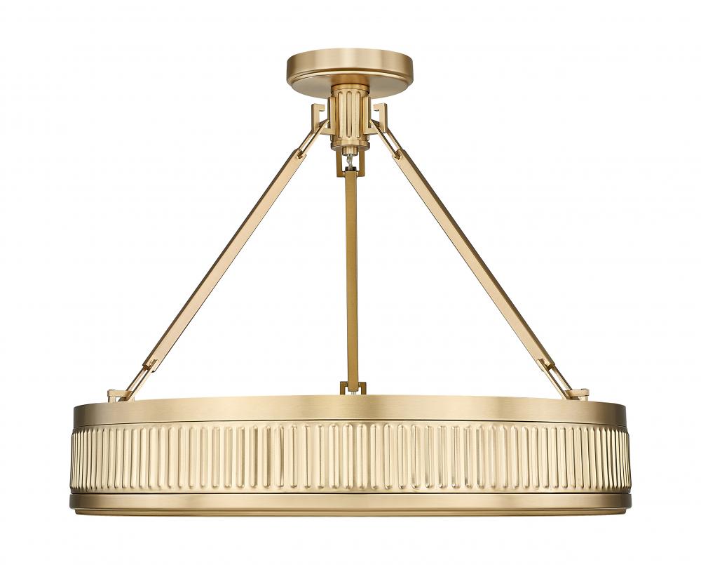 Capture mid-century design aesthetics with the intriguing textured band details featured on this modern three-light semi-flush mount ceiling light. Beautiful over a living room seating group or chic bedroom, it offers an opaque diffuser and a rich, warm modern gold finish for wonderful ambiance. This fixture is equipped with a Z-Lite EZ change LED module that offers energy efficiency, light color selectability, and dimming capabilities.