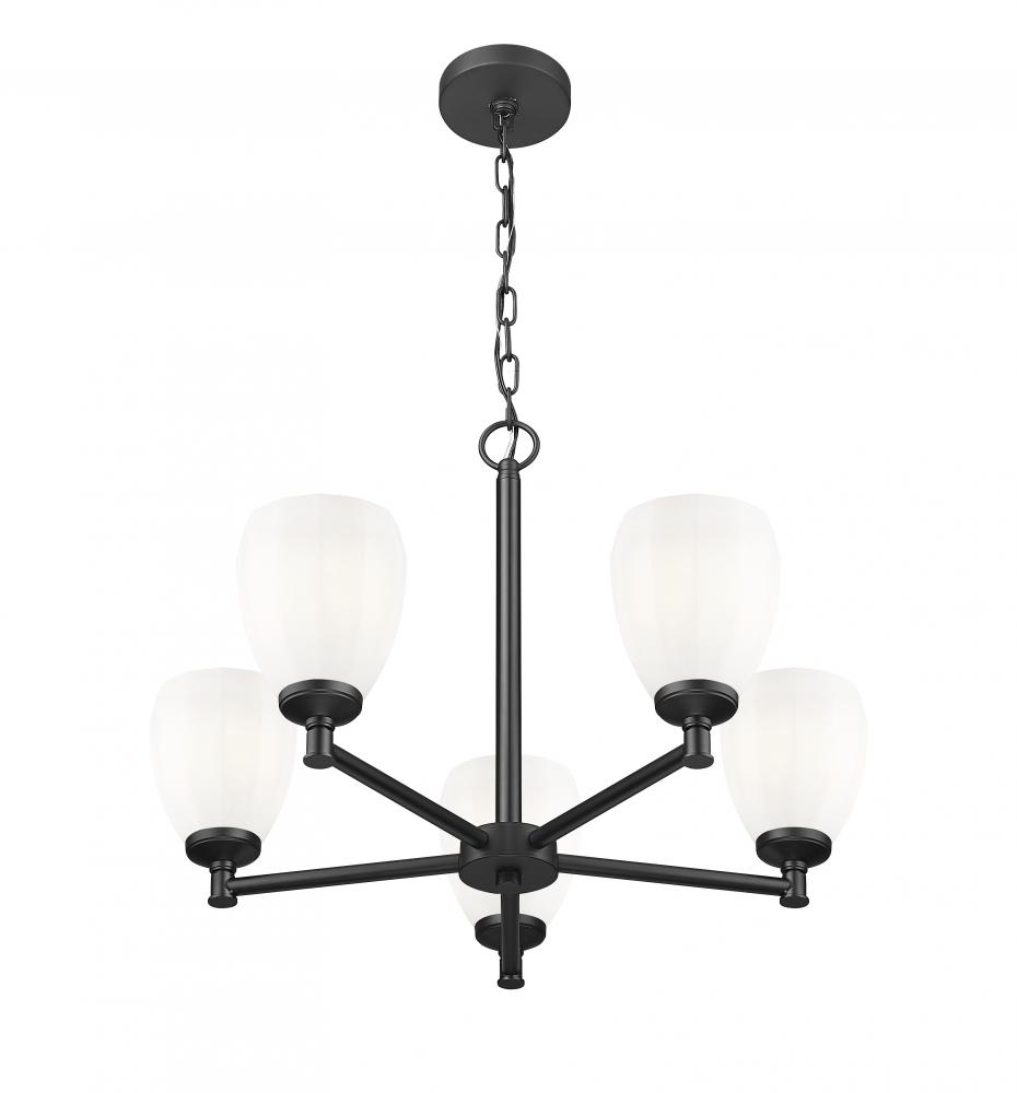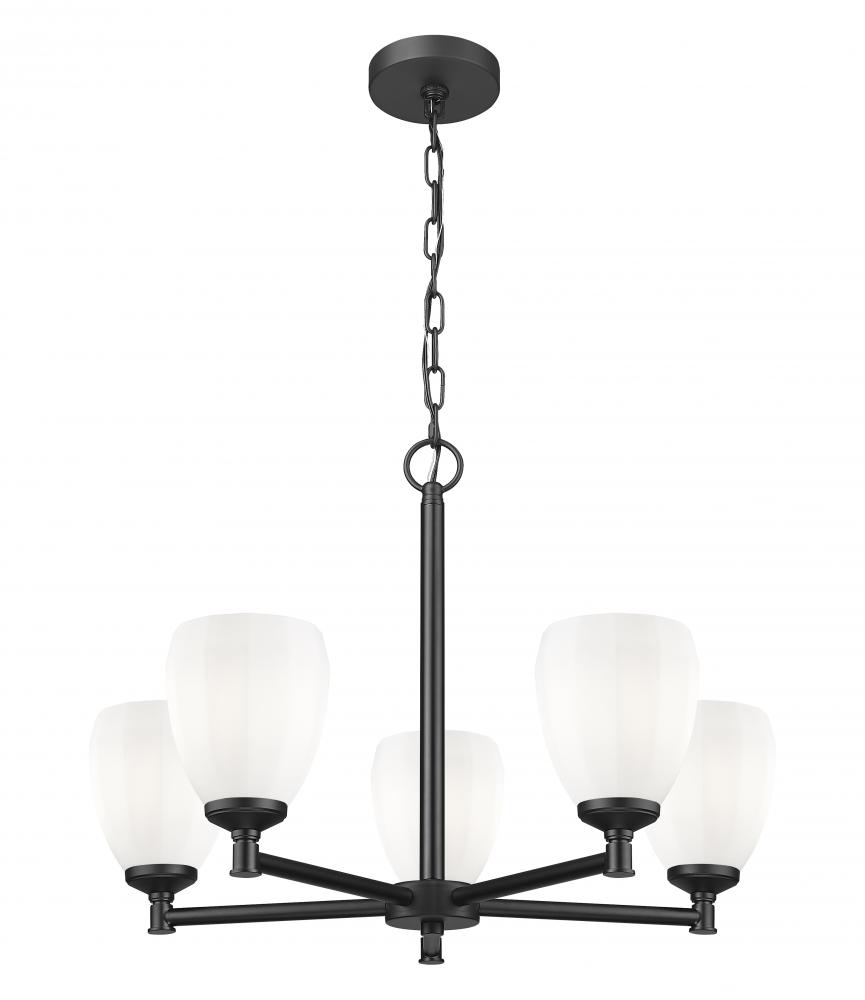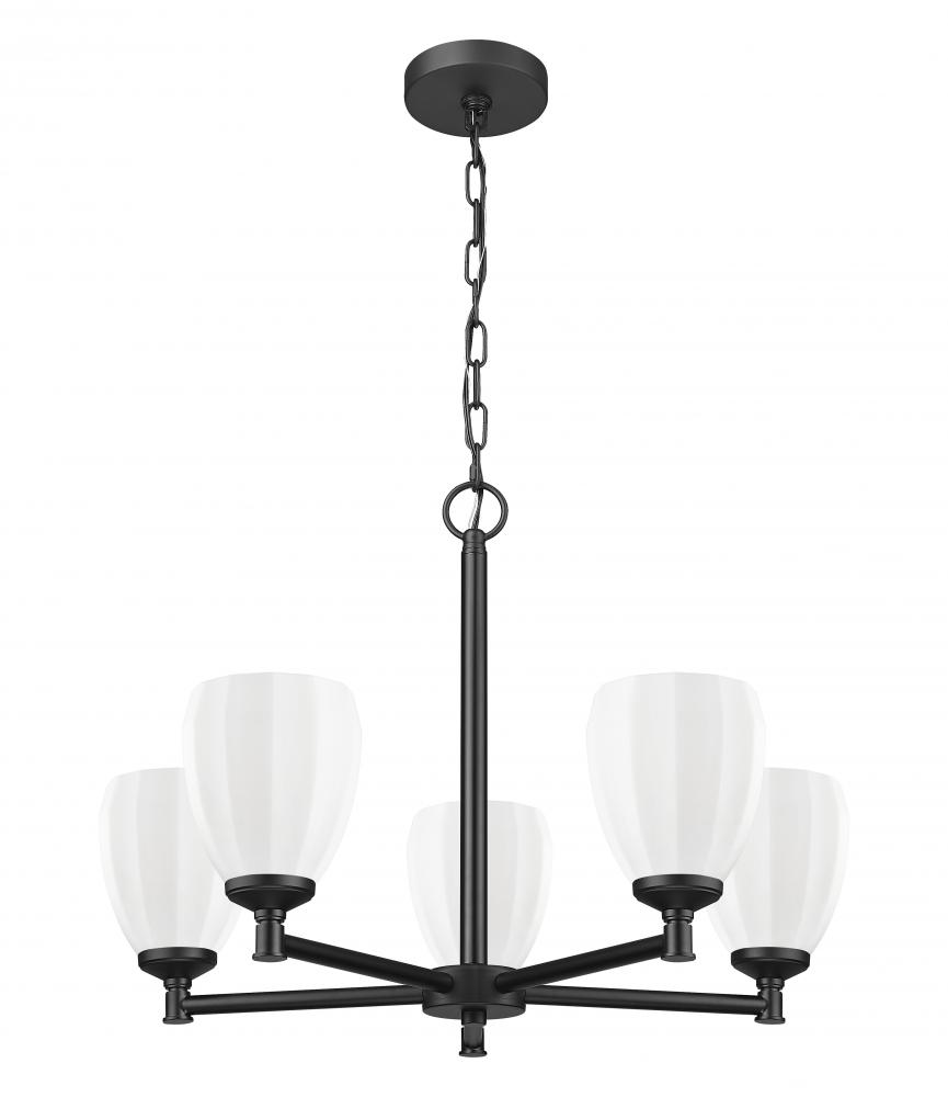 Put a fresh spin on your breakfast nook or dining room with a modern five-light chandelier. Intriguingly shaped matte opal glass diffuses illumination for inviting ambiance, while a matte black finish over a clean-lined frame creates ample contrast and depth.