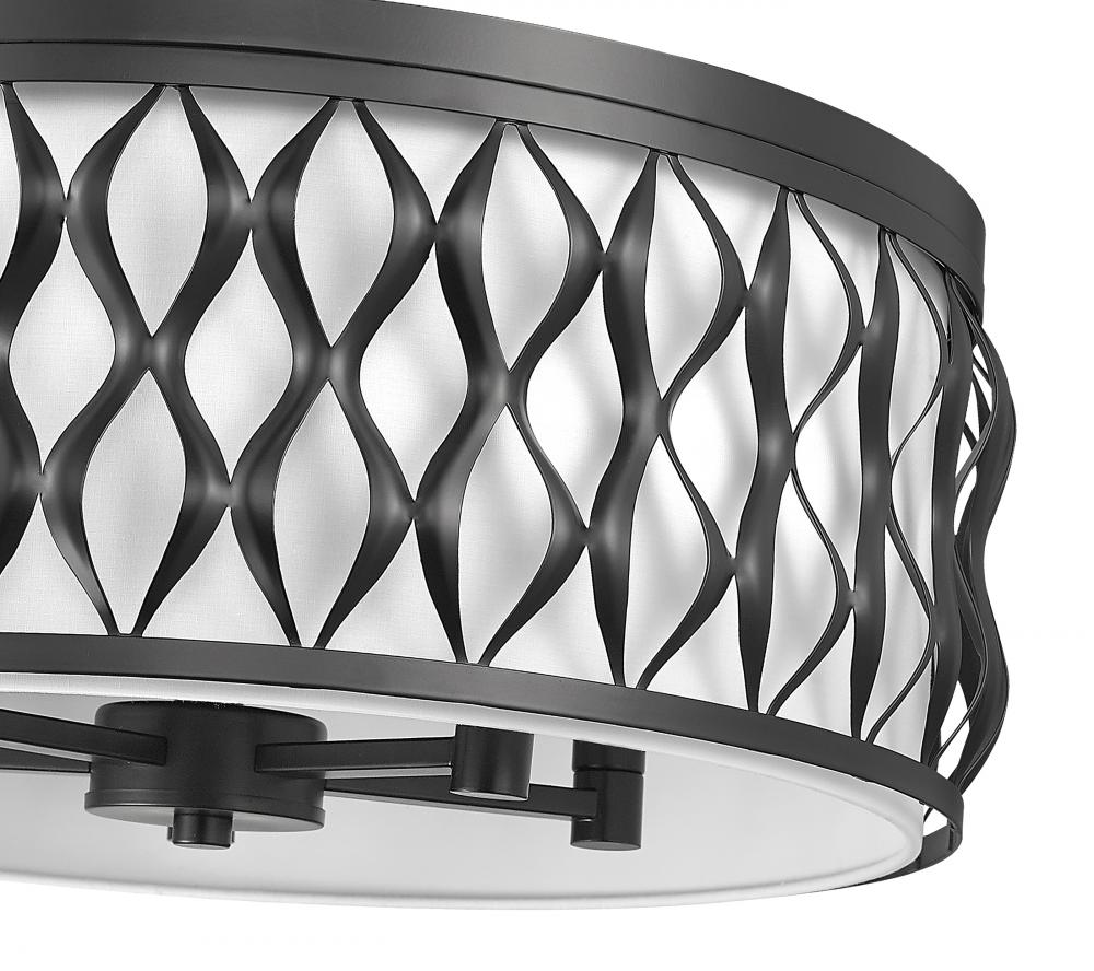 Embrace an iconic style motif in a sculptural and fashion-forward five-light flush mount ceiling light constructed of bold matte black finish steel. Living rooms, dining spaces, and foyers receive a timeless aesthetic with a drum-shaped fixture featuring symmetrical ribbon waves cascading vertically, banded on both edges. A white diffuser filters glowing light, creating superb optical ergonomics.