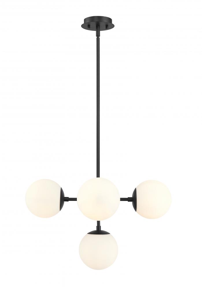 This chandelier is extremely stylish and architecturally inspired. Its airy frame maintains a refined look while the seemingly floating etched white glass globes provide incredible ambiance. Finish: black frame + white globe.