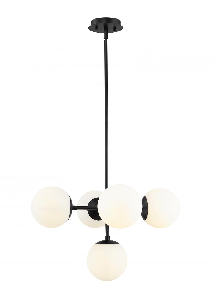 Send visual cues upward to capture a whimsical, charming look in a dining or main living space. Modern styling with strong industrial elements forms a delightful pendant light that works in a casual kitchen as well. A linear matte black finish steel frame sets the stage for a festive arrangement of five matte opal glass globe bulbs to create mood-lifting ambiance that lends a hint of space-age personality to this enticing light.
