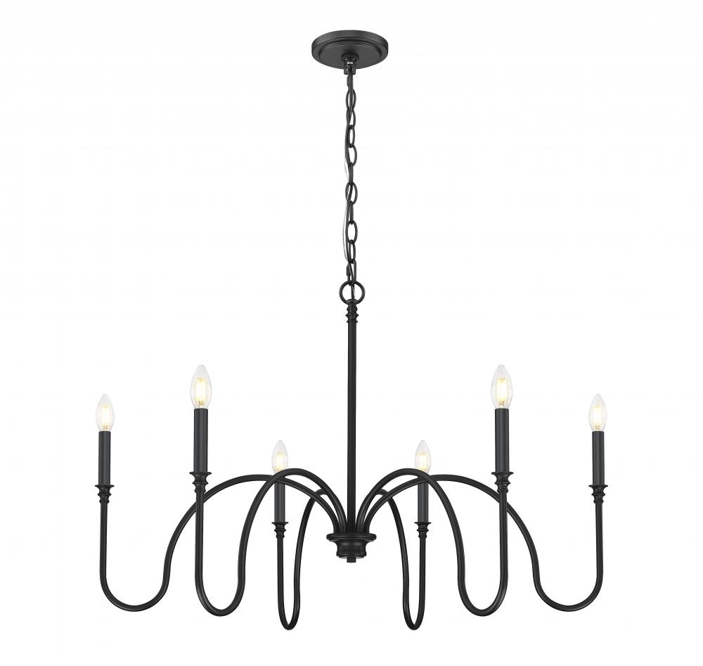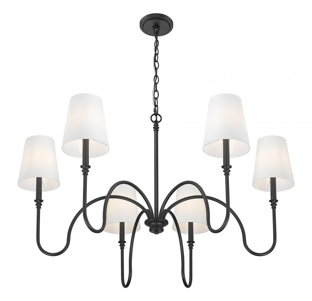 Plenty of illumination flows from a six-light chandelier with an open-air motif and a timeless look of classic style. Constructed of matte black finish steel, its wiry motif results from dramatic curving of slender steel arms, each capped with subtle detail and an iconic linen shade. Lighting is dimmable to suit both moods and time-of-day needs.