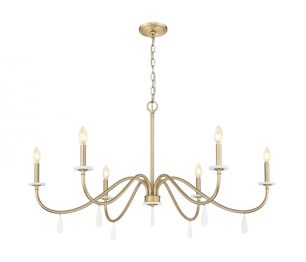 Sweeping curves create optically pleasing arms in a six-light chandelier with timeless, elegant style. This modern gold finish steel fixture is a beautiful choice for lighting dining rooms, living rooms, and entryways, with decorative alabaster boboches and suspended droplets embellishing its motif. This light offers dimmable illumination levels to match moods and adjust to needs.