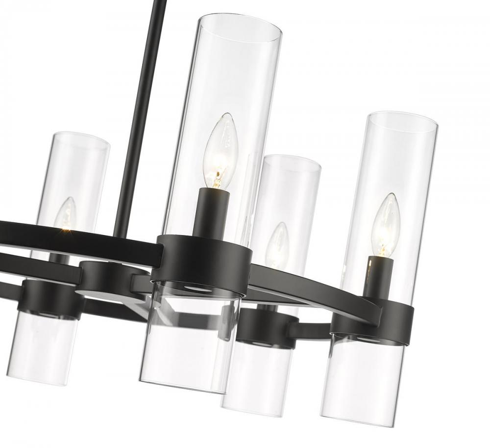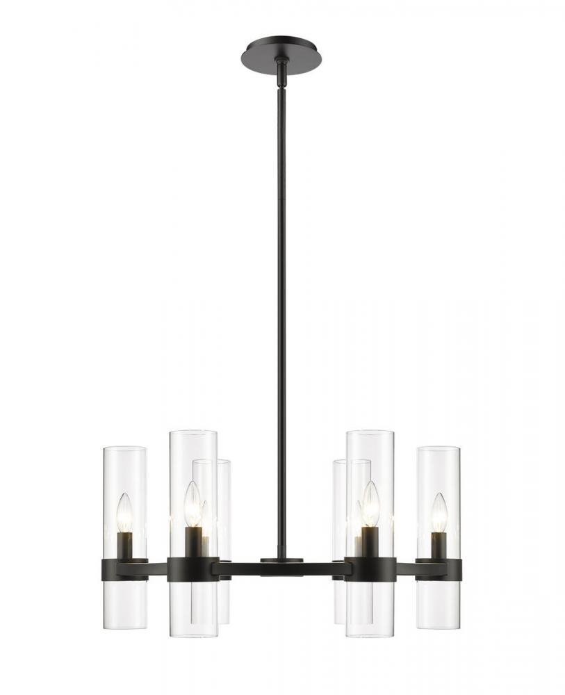 Take a minimalist approach to lighting a custom space, starting with the sophisticated design of this matte black iron and glass six-light chandelier. Perfect for a small- to mid-sized contemporary dining room, kitchen, or hallway, the Datus chandelier delivers drama with a round frame crafted of bold matte black finish steel, dressed up with delicate clear glass cylinder shades.
