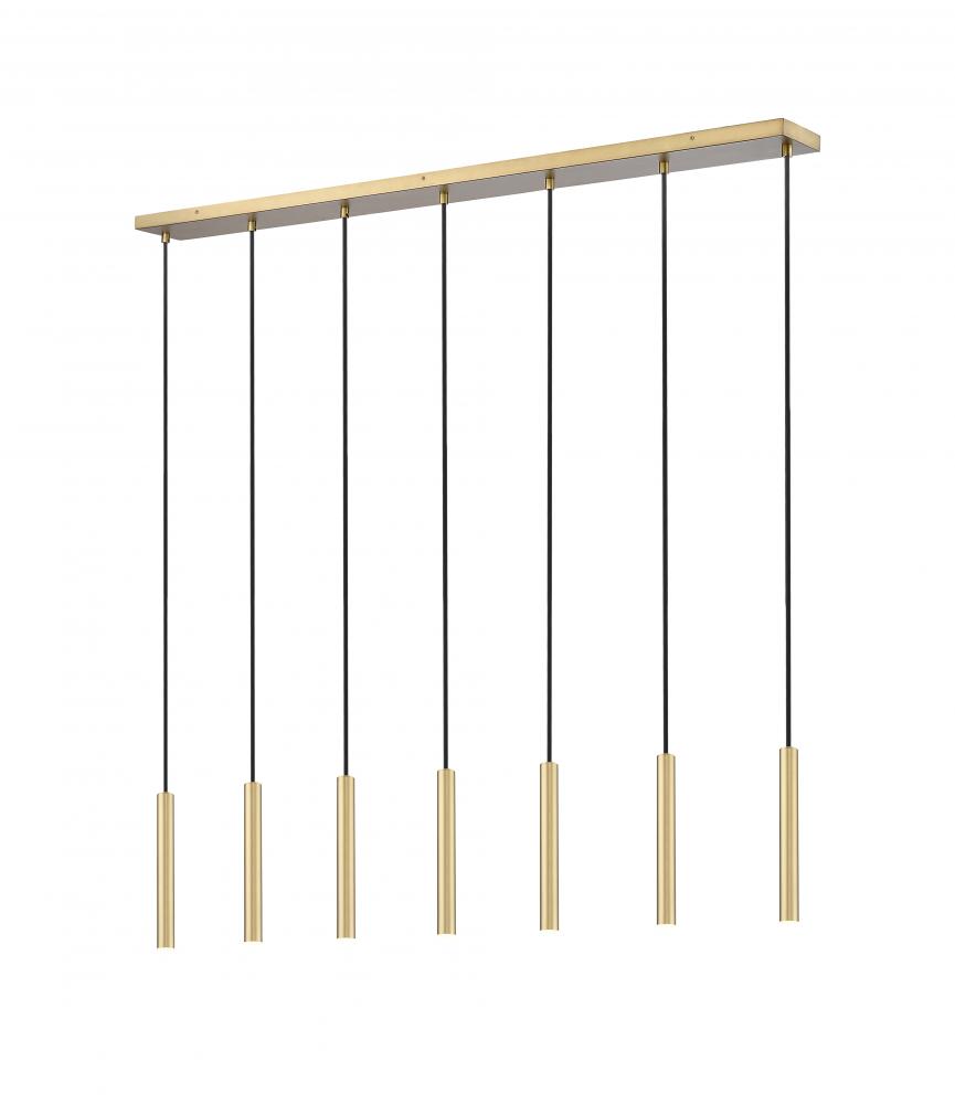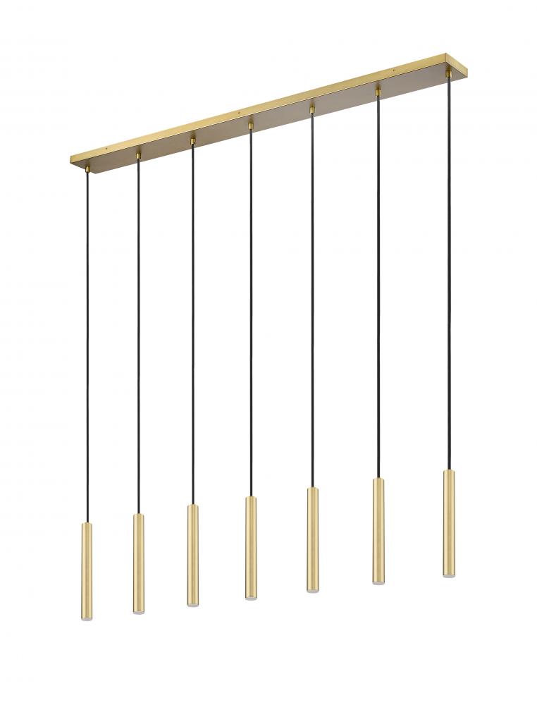 A modern gold finish sets a refined, inviting tone for this contemporary seven-light linear chandelier. Featuring energy efficient LED lights in slim housings, this minimalist design is ideal over a kitchen island or dining table, delivering both sophisticated style and dimmable illumination.