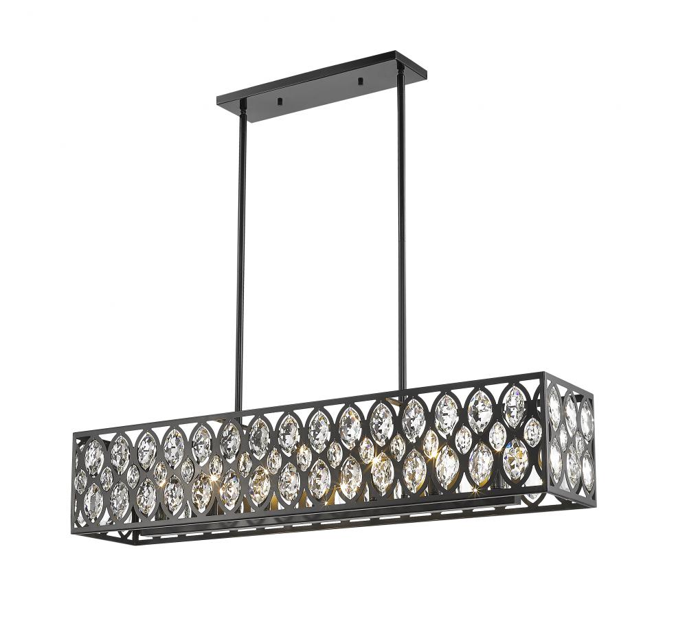 From the Dealey collection comes this contemporary seven-light chandelier, featuring a box-like rectangular design and held by two rod supports. Its elegant steel shade is punched with an ellipse-style motif, each set with a glimmering clear crystal pendant that adds stark contrast against the dark matte black finish. With an elongated shape, this chandelier spreads a warm, even glow across a wide dining table or along a hallway, adding a touch of glamour as well.