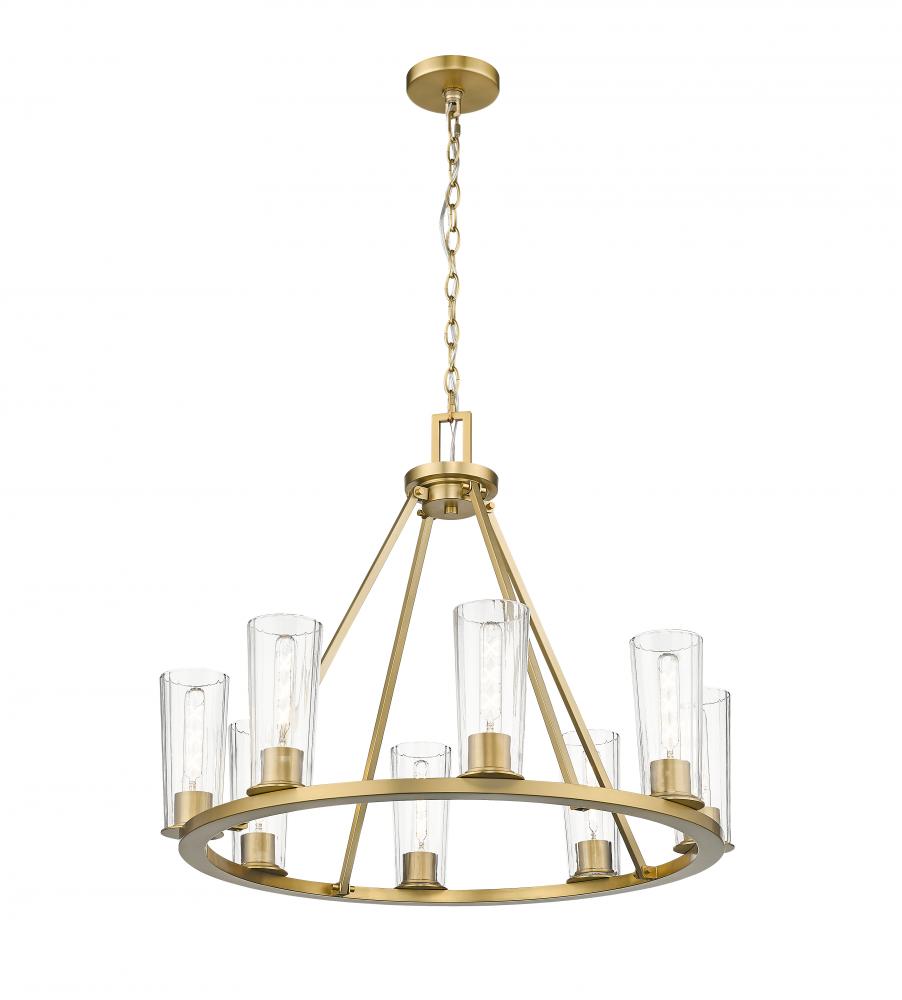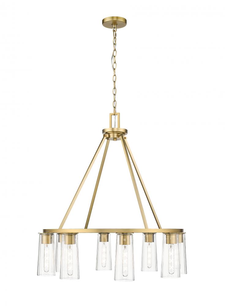 Add distinction to your foyer or dining room with a modern industrial eight-light chandelier. The ring silhouette offers timeless appeal, while bright illumination filters through tapered clear glass shades. Its modern gold finish lends a sophisticated touch, while tubular bulbs are the right dose of vintage allure.