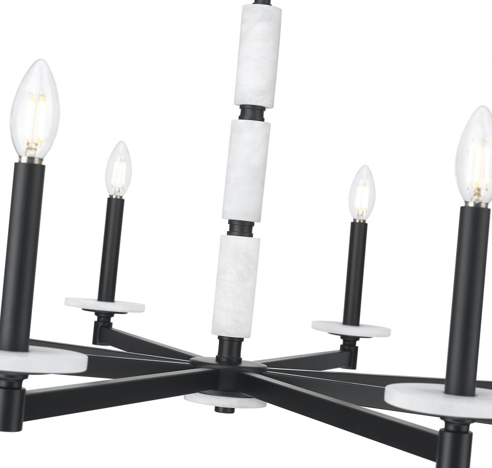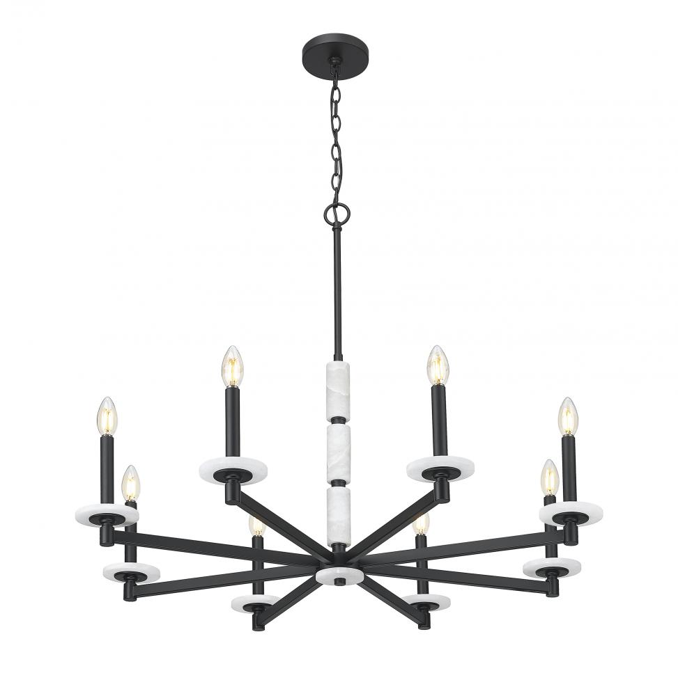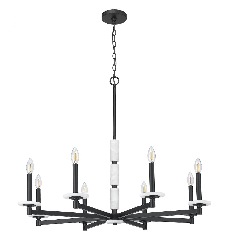 This chandelier brings bold elegance to the heart of the room. Eight alabaster spheres circle a matte black frame, offering contrast and glow in perfect measure. With its sculptural layout and soft light, it?s made to captivate.