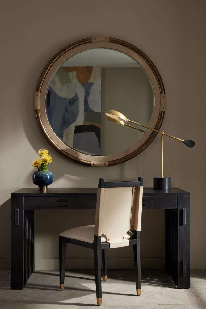 A traditional round of beveled glass is elegantly framed with antiqued brass bullnose. An inset and wrapped detail in topstitched ivory leather accented with brass bolts for visual interest. Fitted with a security cleat, this classical style was designed to be hung vertically. Finish will vary.