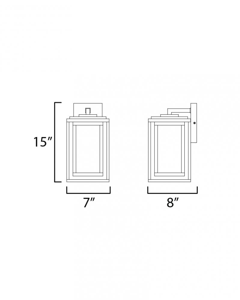 A dual framed structure creates dimension on these outdoor lighting fixtures that is both contemporary and transitional. The construction consists of two frames of square tubing and squared components. The inner frame's Clear Seedy glass reduces glare