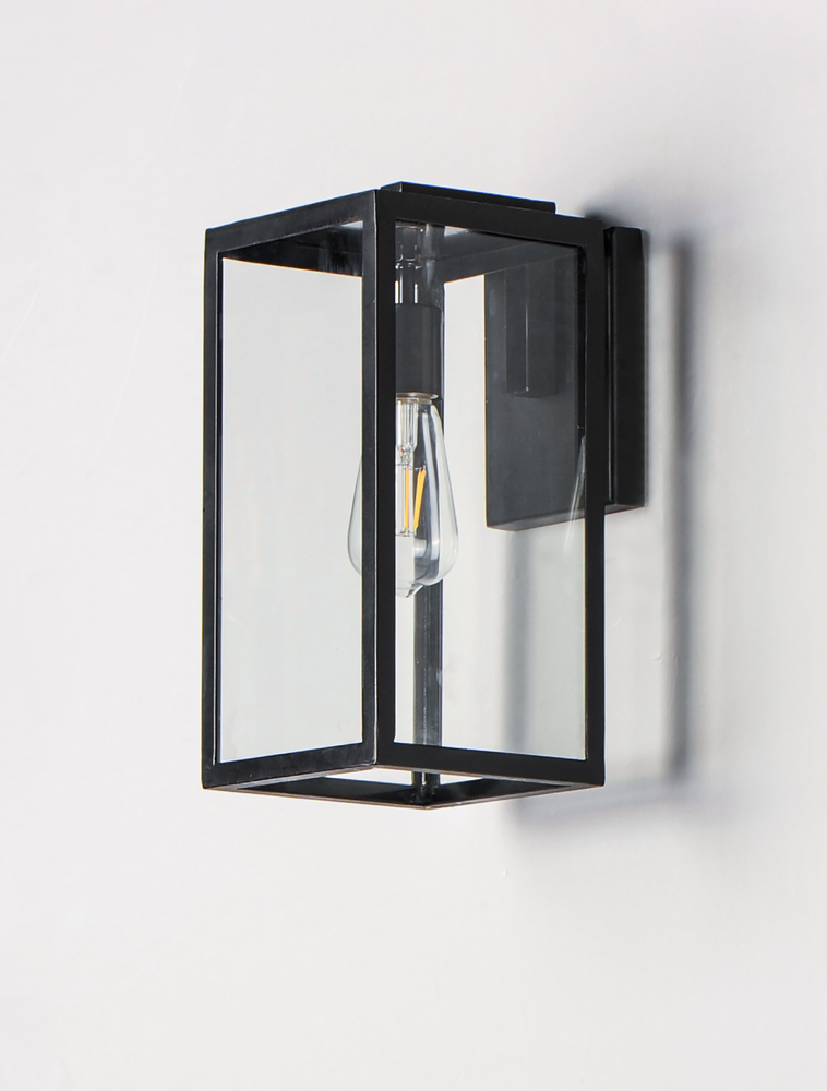 An elongated rectangular shaped design that is both minimalist and industrial. Die cast frames of Dark Bronze support Clear glass panels that provide an unobstructed view of the lantern's interior. Customize with your choice of lamps from vintage to tu