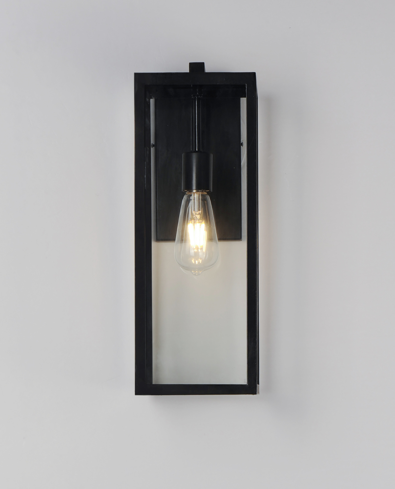 An elongated rectangular shaped design that is both minimalist and industrial. Die cast frames of Dark Bronze support Clear glass panels that provide an unobstructed view of the lantern's interior. Customize with your choice of lamps from vintage to tu