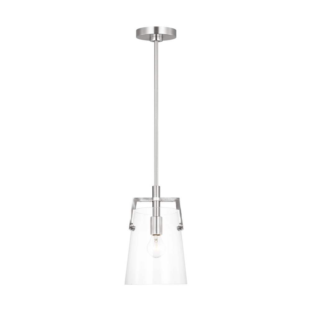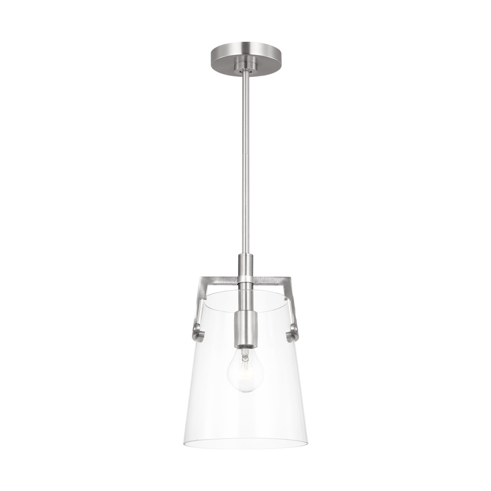 Add a bright burst of light where you need it most with the stylish Drew & Jonathan Crofton one light pendant, featuring a sleek colonial crackle clear glass shade. Made to coordinate across a broader range of bath hardware and design styles, the Crofton is available in four popular finishes, Brushed Steel, Chrome, Midnight Black, and Satin Brass. This light looks great on its own or installed above a bathroom vanity, and the glass shade makes it ideal for filament bulbs. This fixture may be mounted in the up or down position, and is cETL listed for damp locations, making it the perfect lighting solution for any space.