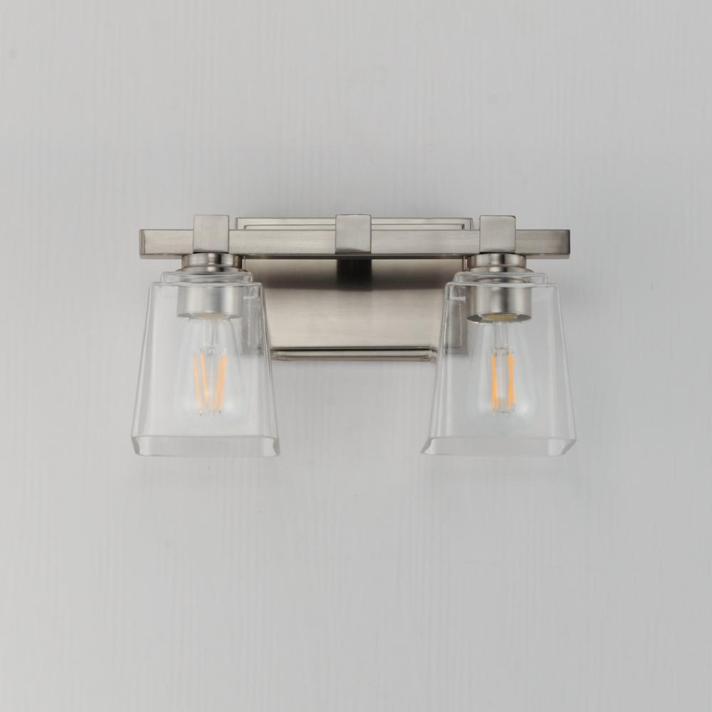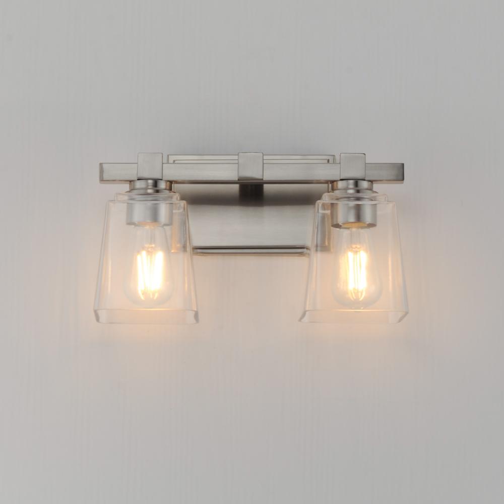 A composition of square forms that feature a Clear tapered square glass shade, these bath vanities provide a transitional design that suits both modern and traditional spaces. Available in Matte Black, Polished Chrome, Satin Nickel, and Natural Aged Brass.