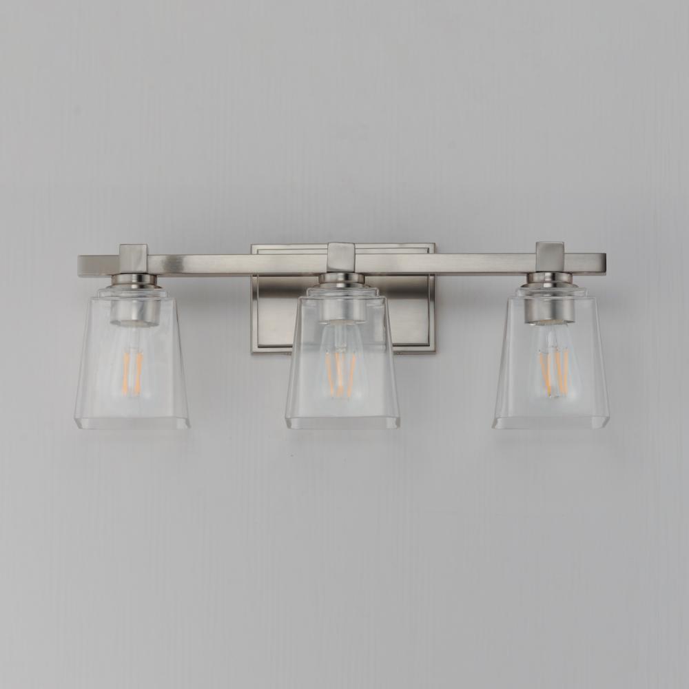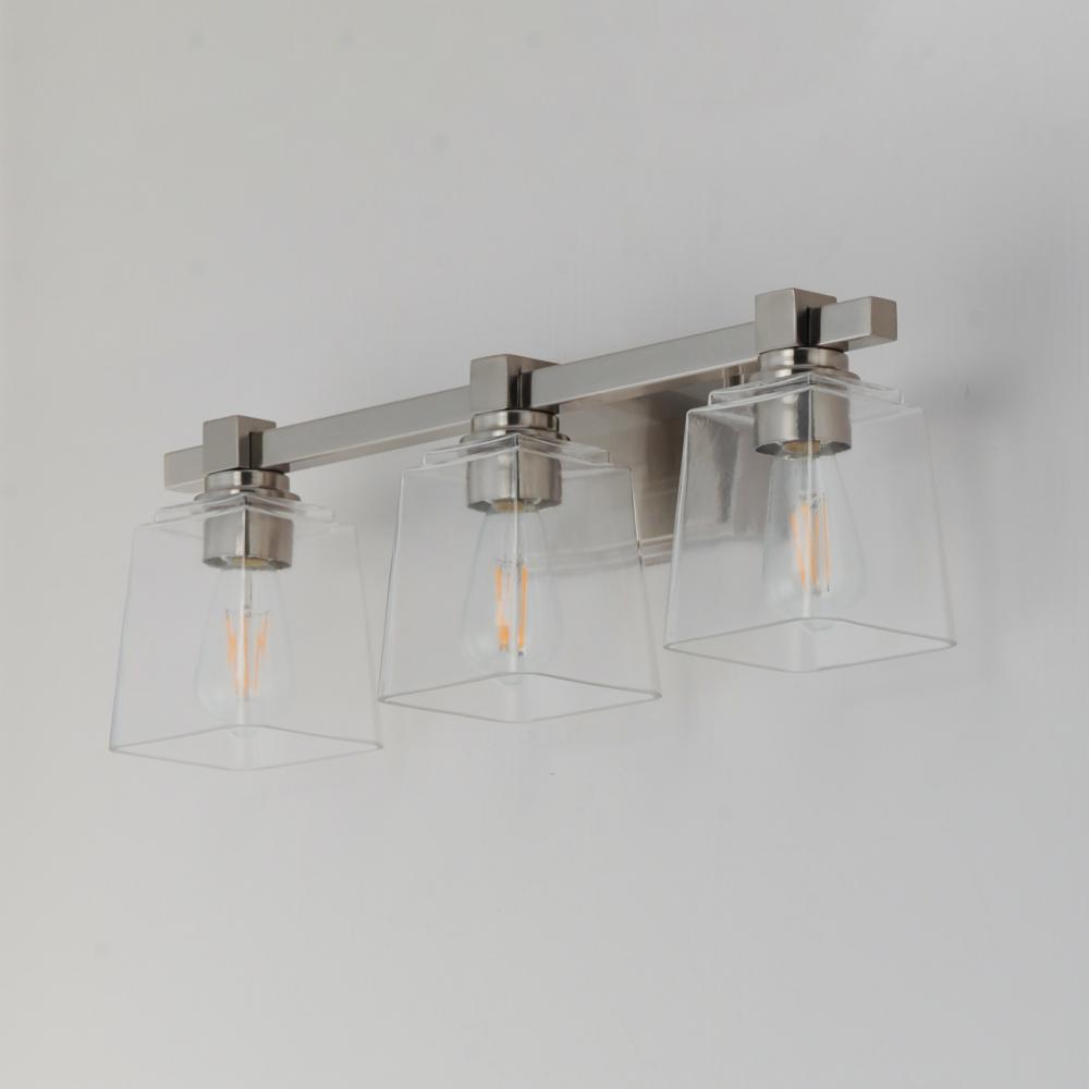 A composition of square forms that feature a Clear tapered square glass shade, these bath vanities provide a transitional design that suits both modern and traditional spaces. Available in Matte Black, Polished Chrome, Satin Nickel, and Natural Aged Brass.