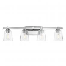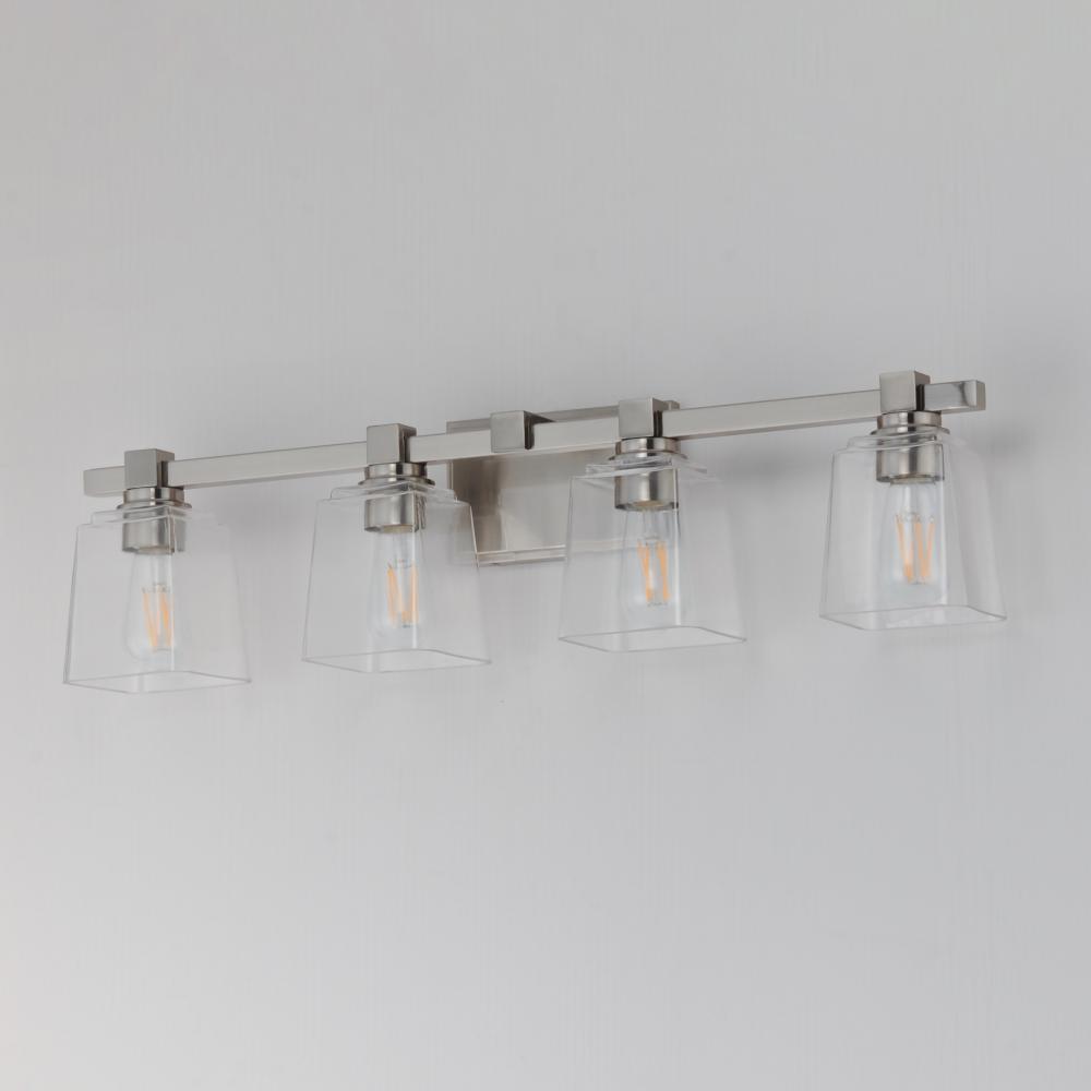 A composition of square forms that feature a Clear tapered square glass shade, these bath vanities provide a transitional design that suits both modern and traditional spaces. Available in Matte Black, Polished Chrome, Satin Nickel, and Natural Aged Brass.