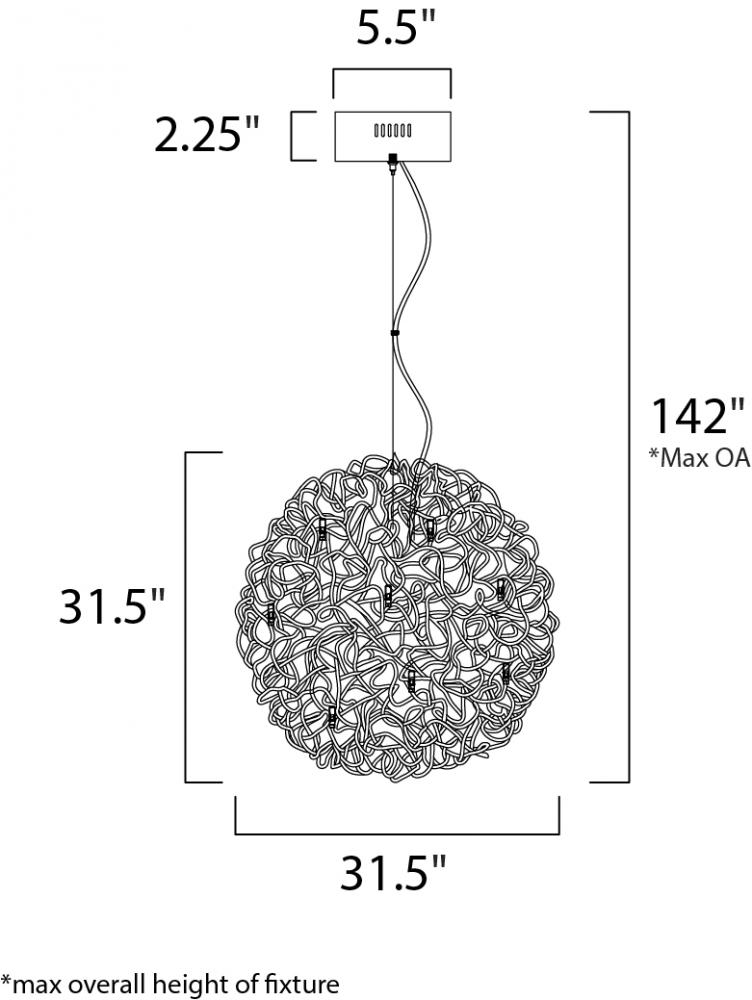 Sculptures created from Polished Chrome aluminum rods are formed by hand into a mod-silhouette, perfect for loft living and cosmopolitan lifestyles. Woven through the interior are strings of clear G4 Xenon lamps that add sparkle as they reflect off of the