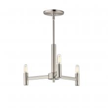 Straight extensions of rectilinear arms emanate from a cylindrical center housing in this transitional design. The candelabra is made in a corresponding cylindrical form playing into the geometries of this streamlined chandelier design. Available in a text