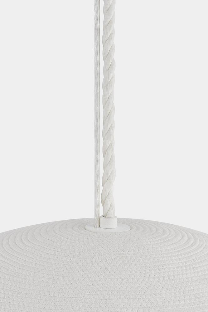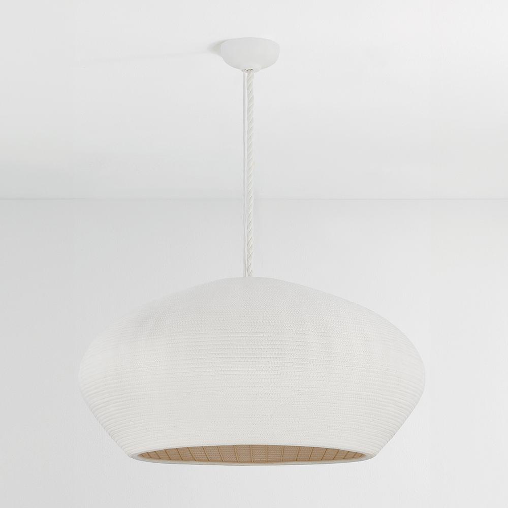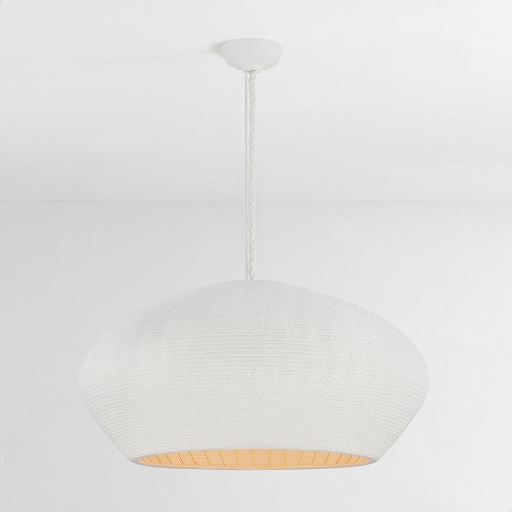 Entirely handcrafted from white coiled cotton cord, the Fishkill pendant is a pure expression of materiality. The small gaps between the coils allow light to escape, creating a warm, glowing effect that fills the entire shade. Available in two sizes, Ferndale lends a fresh, airy quality to contemporary spaces. Due to the one-of-a-kind nature of the medium, exact colors and patterns may vary slightly from the image shown.