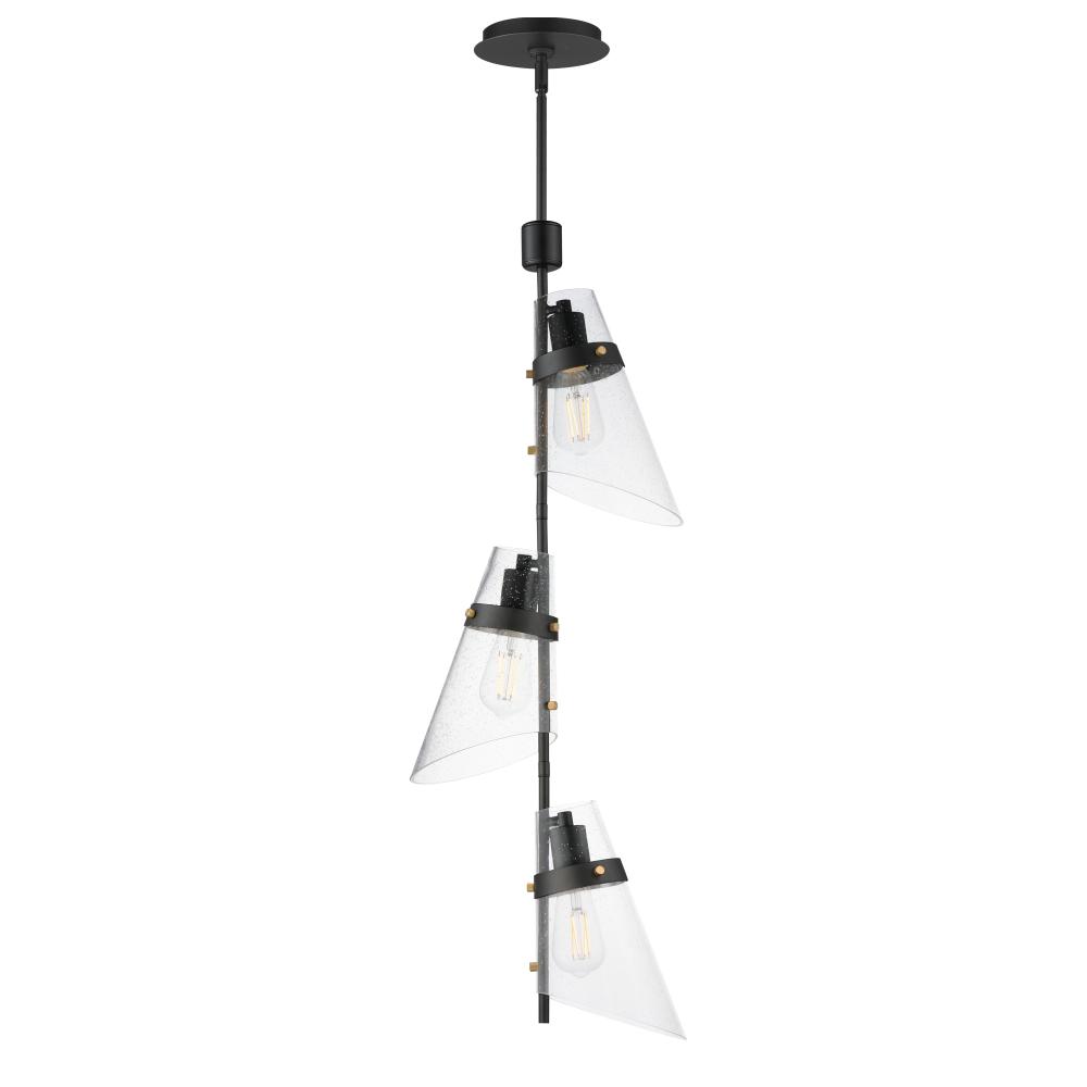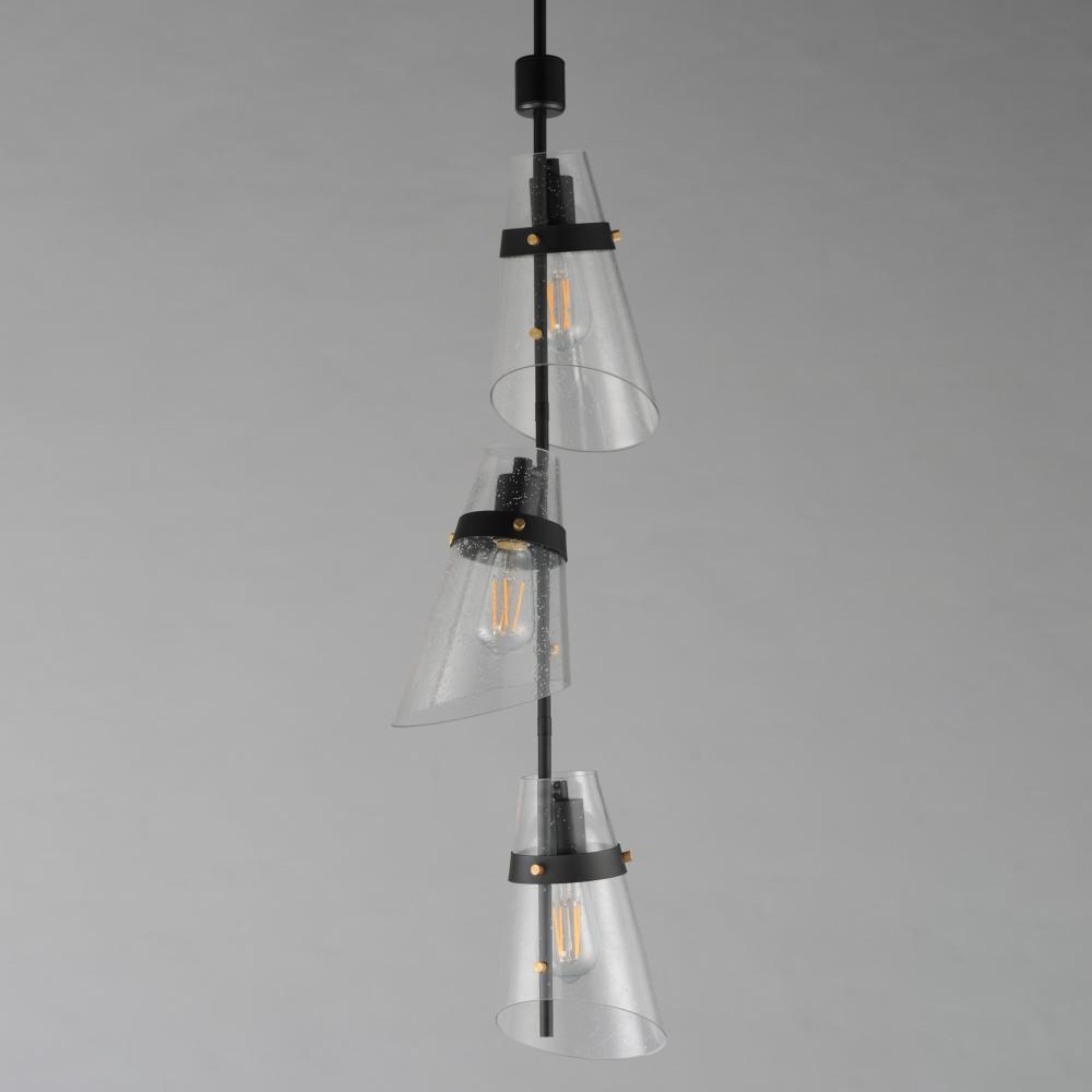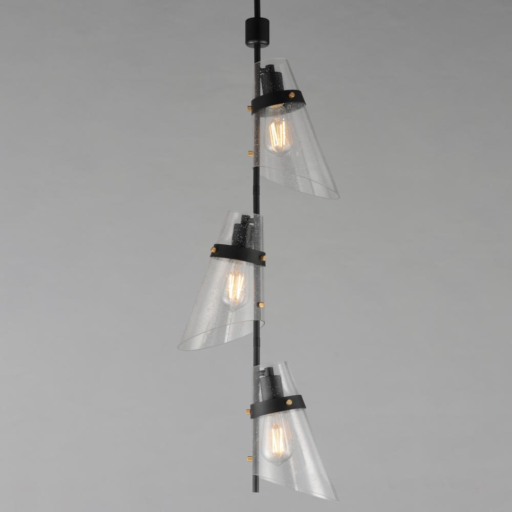 Architectural and effortlessly striking, the Finch collection reimagines classic forms through a modern lens. Tapered cones of clear seedy glass are precision-cut on a diagonal slant, creating dynamic lines that shift with perspective. The Dark Bronze fram