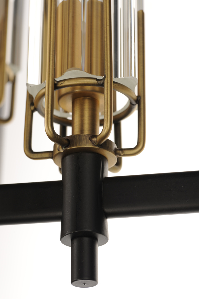 Dramatic and opulent, light sources shine through exquisite Clear scalloped glass hurricane shades as they seemingly float on unique metal prongs finished in Antique Brass. The brass accents are contrasted with a Black frame configured in cascading pendant