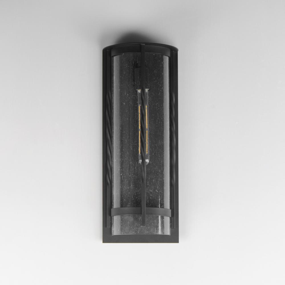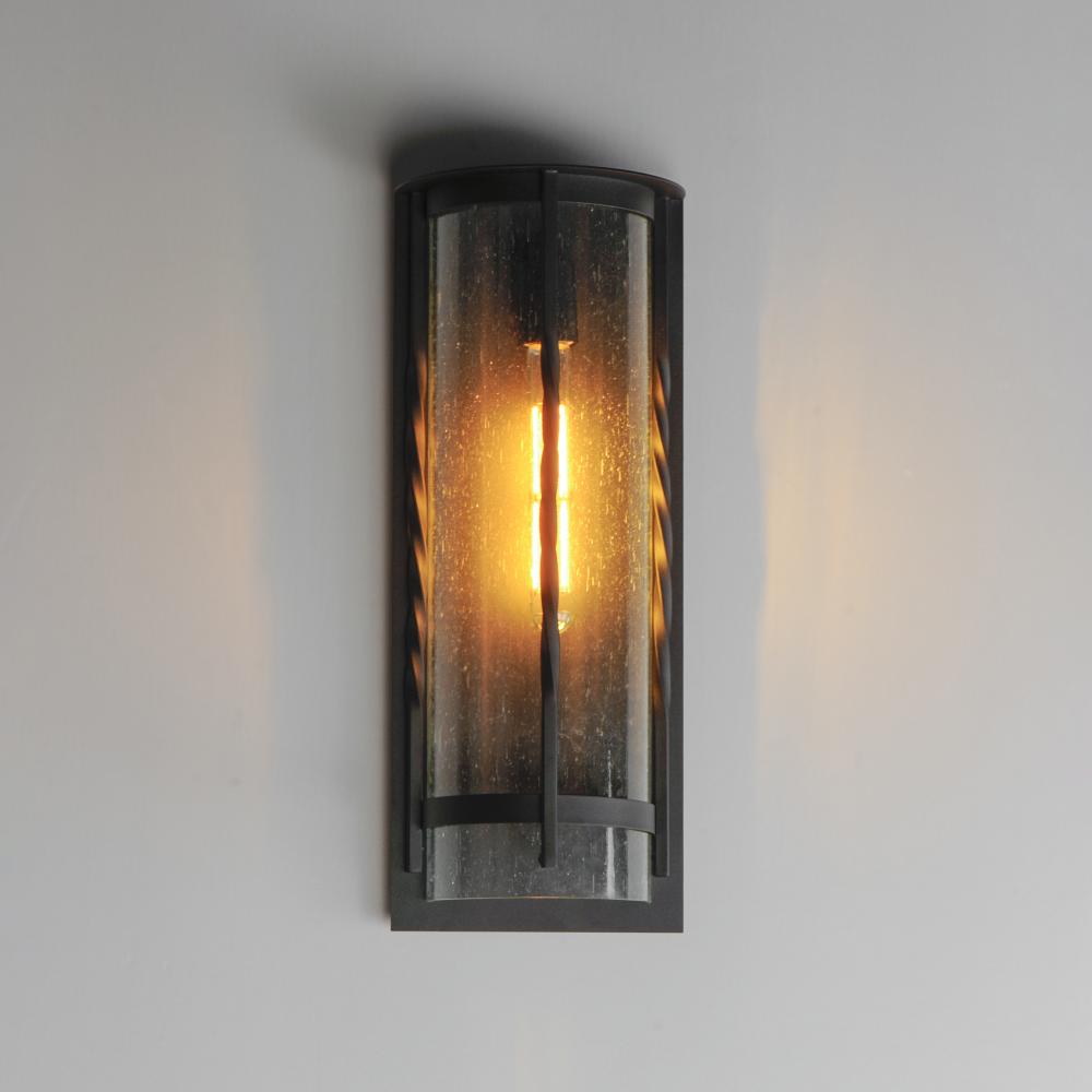 Forged iron spindles twist along the frame of a half round sconce. Transitional in design, they are finished in a Neutral Black outdoor rated powder coat and feature Clear Seeded glass. Use tubular lamps to accentuate the height of the sconces.