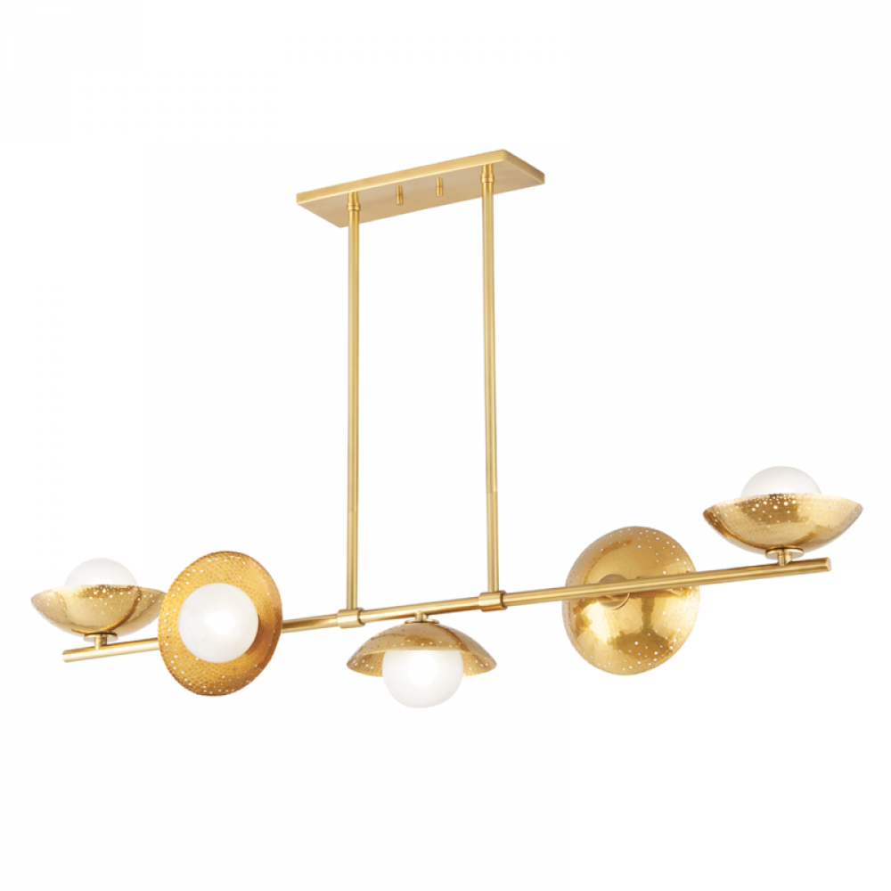 With perforated Aged Brass shades and clear globes etched on the inside, it's easy to see how Glimmer got its name. Light fills the glass and reflects beautifully off the metal while also seeping through the holes creating a stunning shimmer. The unique placement of the shades on the sconce, pendant, chandelier, and linear provide all-around light.