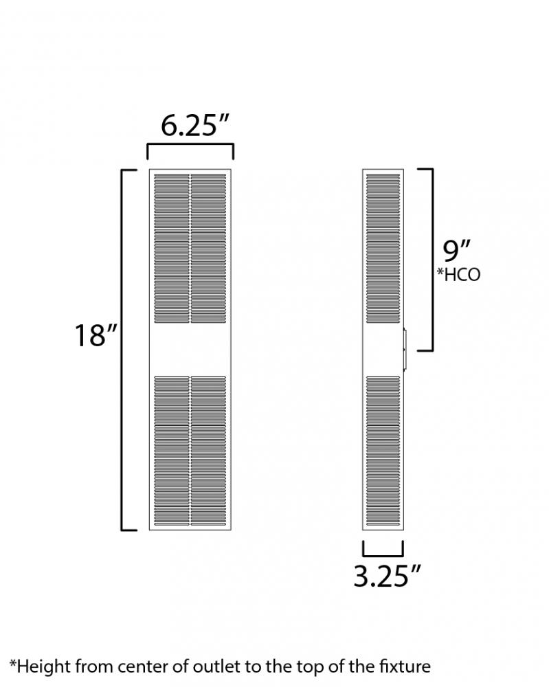 An array of precise slits are stacked in two columns on rectangular shade forms of various sizes. Housed in a blocked out space is a recessed LED light source that casts a filigree that radiate onto the surface surrounding the sconce making a dazzling disp