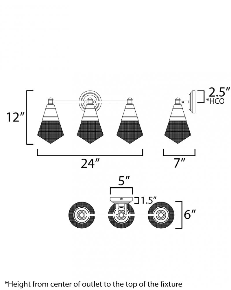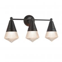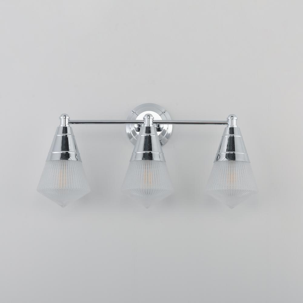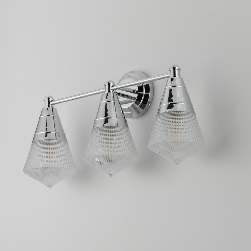 A prismatic diffusion of light is housed within pressed cone glass shades. Choose from pendants with tapered metal halves that conceal the light source or glass shades that are supported by a metal ring. Coordinating bath vanity lights complete the collect