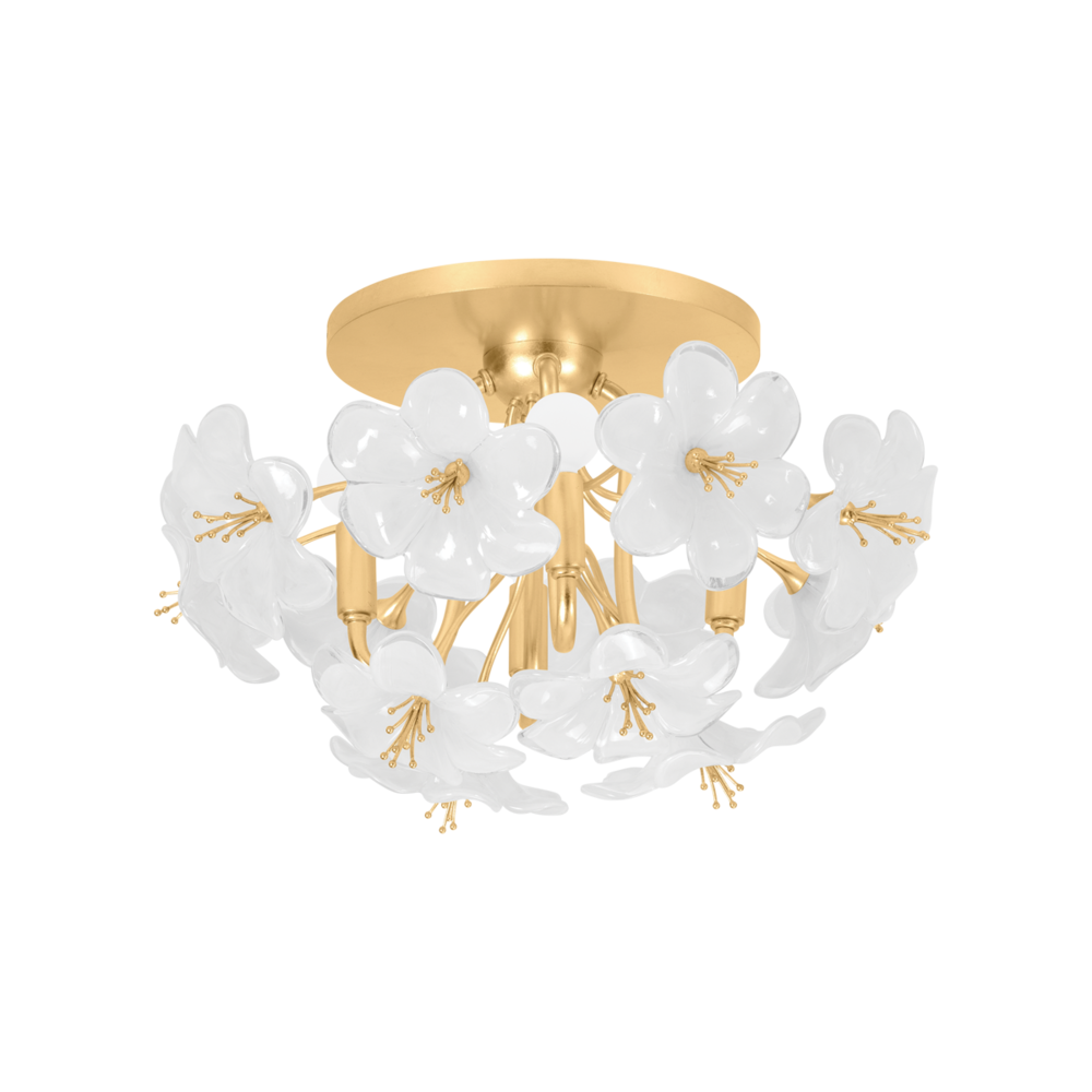 An airy spray of white glass flowers forms the cloud-like silhouette of Hygea. Gold Leaf arms act as stems, supporting the delicate blooms as they gently diffuse light. Available as a wall sconce, flush mount, or chandelier in two sizes, Hygea casts a bright glow over modern interiors.